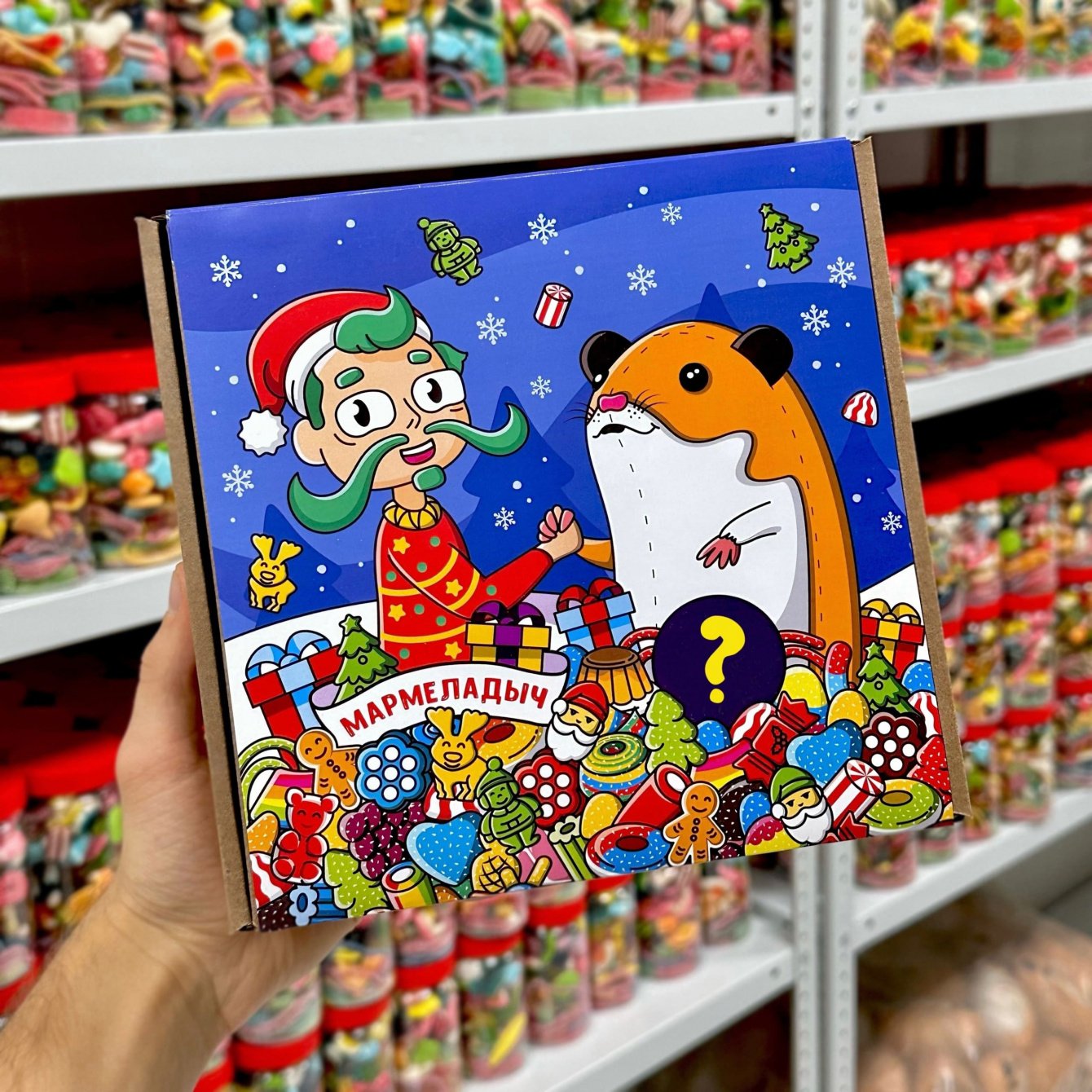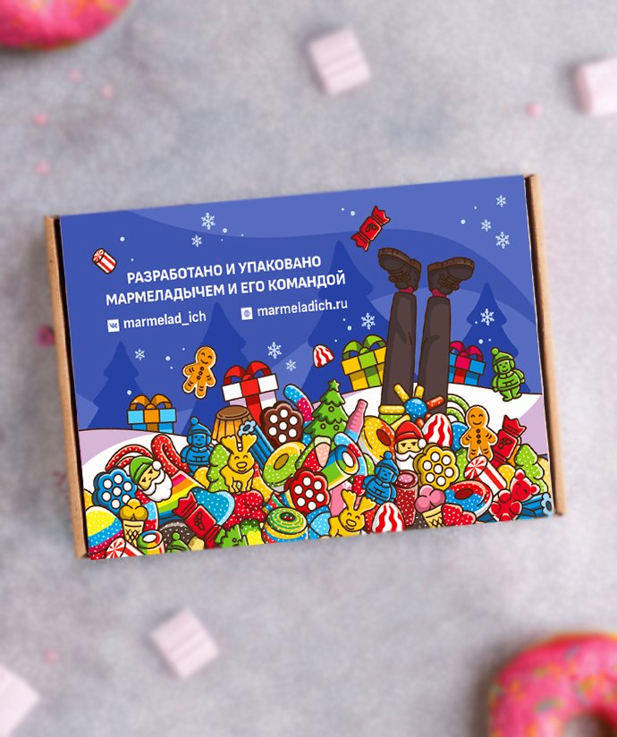 Разработать дизайн упаковки для лимитированных наборов в соответствии с заполненным брифом. По задумке клиента, внутри коробки находится баночка на 500 грамм праздничного мармелада и антистрессовый хомяк Михаил. Последний с легкостью устранит печаль от опустевшей баночки спустя 5 минут после боя курантов.
