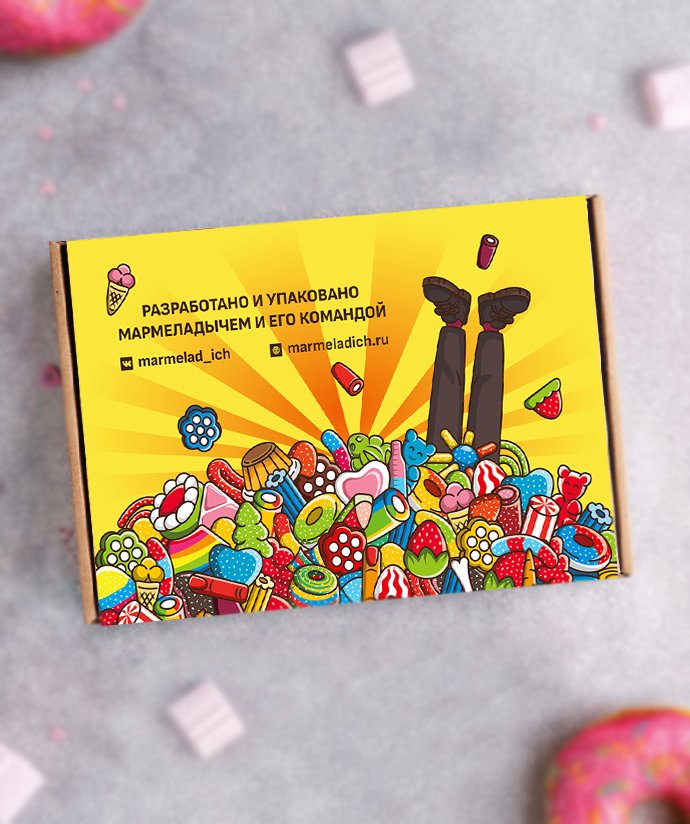 Разработать дизайн упаковки для лимитированных наборов в соответствии с заполненным брифом. По задумке клиента, внутри коробки находится баночка на 500 грамм праздничного мармелада и антистрессовый хомяк Михаил. Последний с легкостью устранит печаль от опустевшей баночки спустя 5 минут после боя курантов.