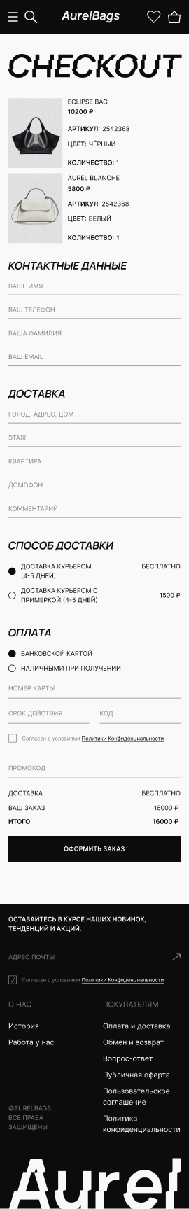 Подчеркивать уникальные особенности бренда. Обеспечить удобную навигацию по категориям сумок. Предоставить понятные карточки товаров с ценой, характеристиками, вариантами цвета и размера. Позволить посетителю быстро оформить заказ.