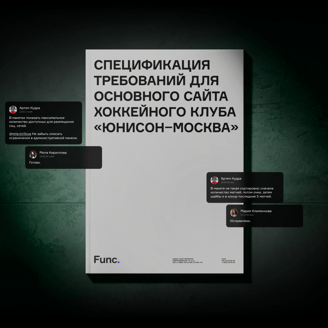 Подготовили спецификацию требований — документ с подробным техническим заданием для разработчиков. Результат — 80 страниц, на которых описан вид пользовательской части, взаимодействие с админ-панелью, логика работы матч-центра и трансляций, создание чемпионата и формирование хоккейных команд.