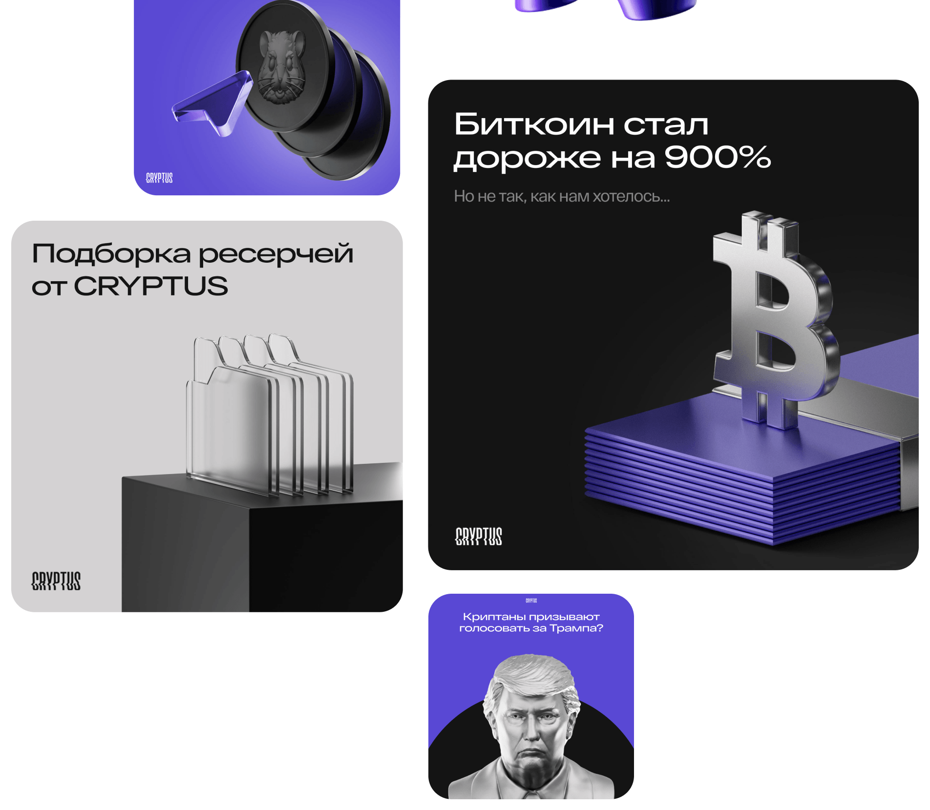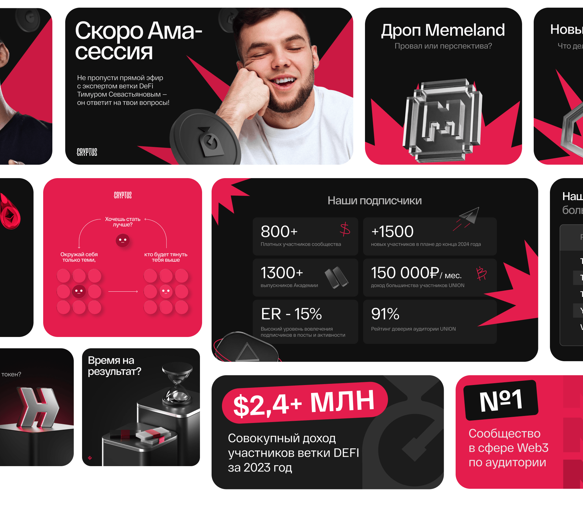 Обеспечить комплексную дизайн-поддержку Telegram-каналов экосистемы Cryptus Media. На фоне высокой конкуренции в инфополе требовалось не только поддерживать высокую частоту публикаций, но и создать узнаваемую айдентику для трёх ключевых продуктов — Cryptus Academy, Cryptus Union и Cryptus Media. Ключевой вызов: выдержать единый стиль при масштабировании контента и обеспечить стабильный выпуск большого объема креативов (более 2 000 единиц) без потери качества и соблюдения сроков.