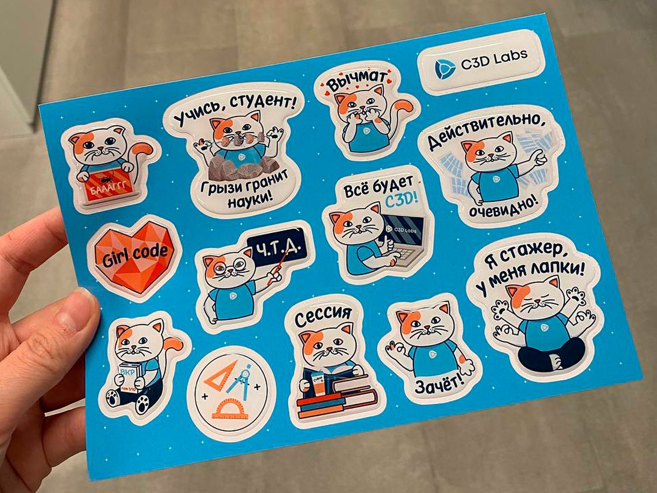 Также был сформирован список фраз, по которым нужно было создать стикеры с новым маскотом. Подготовлен и реализован макет печатных силиконовых стикеров и собран стикерпак в ТГ (https://t.me/addstickers/C3D_Labs_team)