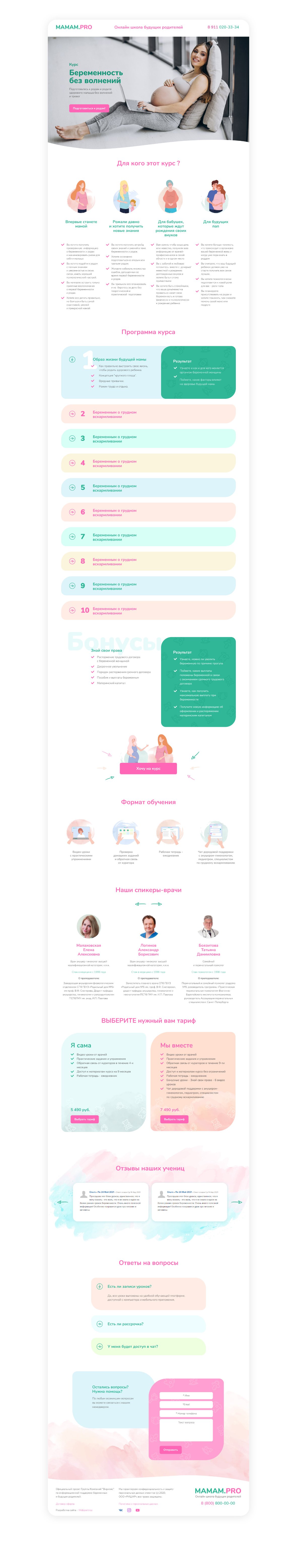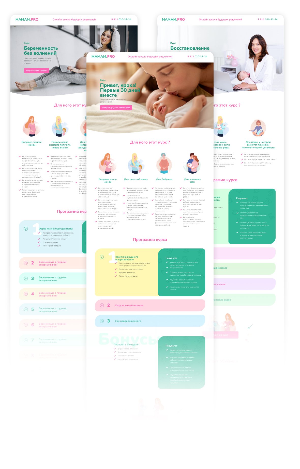 На портале анонсированы курсы для будущих родителей. Для каждого из 3х курсов необходимо разработать посадочную страницу. Стилистика должна быть единой, с небольшим отличием по цвету.
