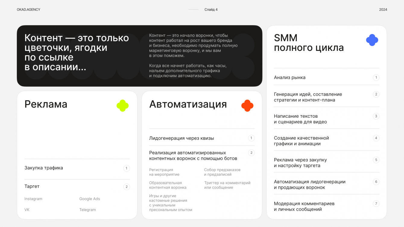 Делаем результативный контент-маркетинг полного цикла: генерация креативных идей, создание контента, реклама и автоматизация.