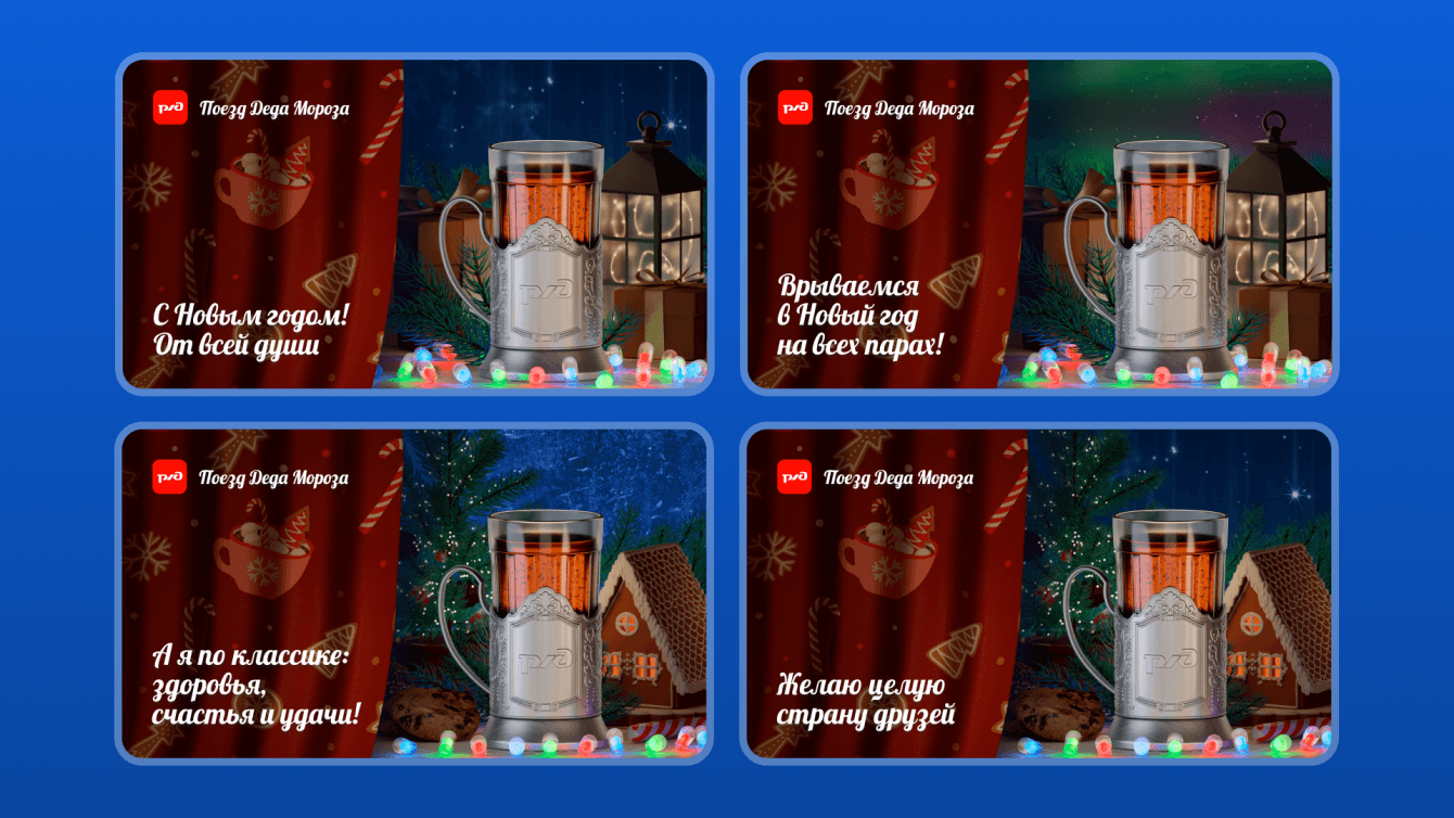 Было важно попасть в стилистику Поезда Деда Мороза и использовать оттенки, ассоциирующиеся с Поездом и компанией РЖД — сумели сделать холодную бело-синюю гамму уютной и создать новогоднее настроение.