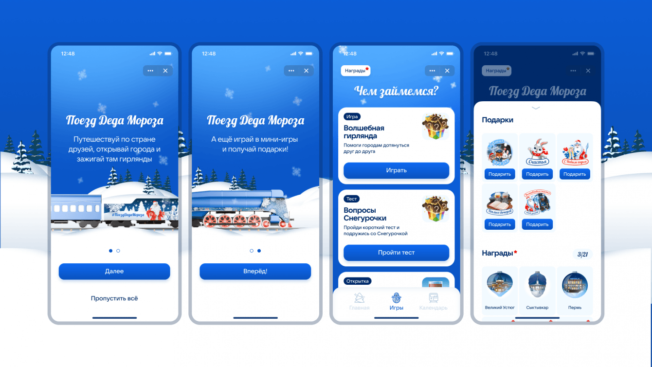 Разработали дизайн мини-приложения «Поезд Деда Мороза», который стал ядром комплексного проекта VK. Мини-приложение доступно пользователям ВКонтакте и Одноклассники, внутри — игры, тест, генератор кастомных открыток и вознаграждения за ежедневные действия.