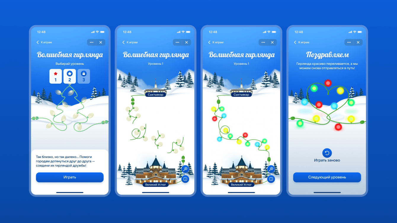 - Мини-игра «Гирлянда дружбы». Пользователю необходимо развернуть фрагменты гирлянды так, чтобы соединить ее между двумя вокзалами и дать дорогу Поезду Деда Мороза.