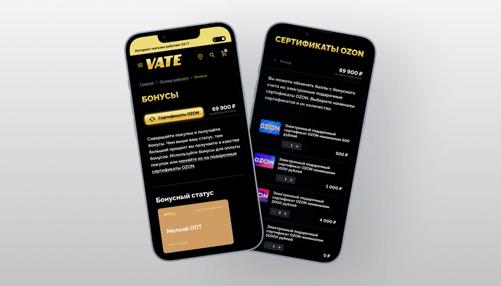 16. Страница для вывода бонусов в виде заказываемых сертификатов OZON (баллы меняем на сертификаты)