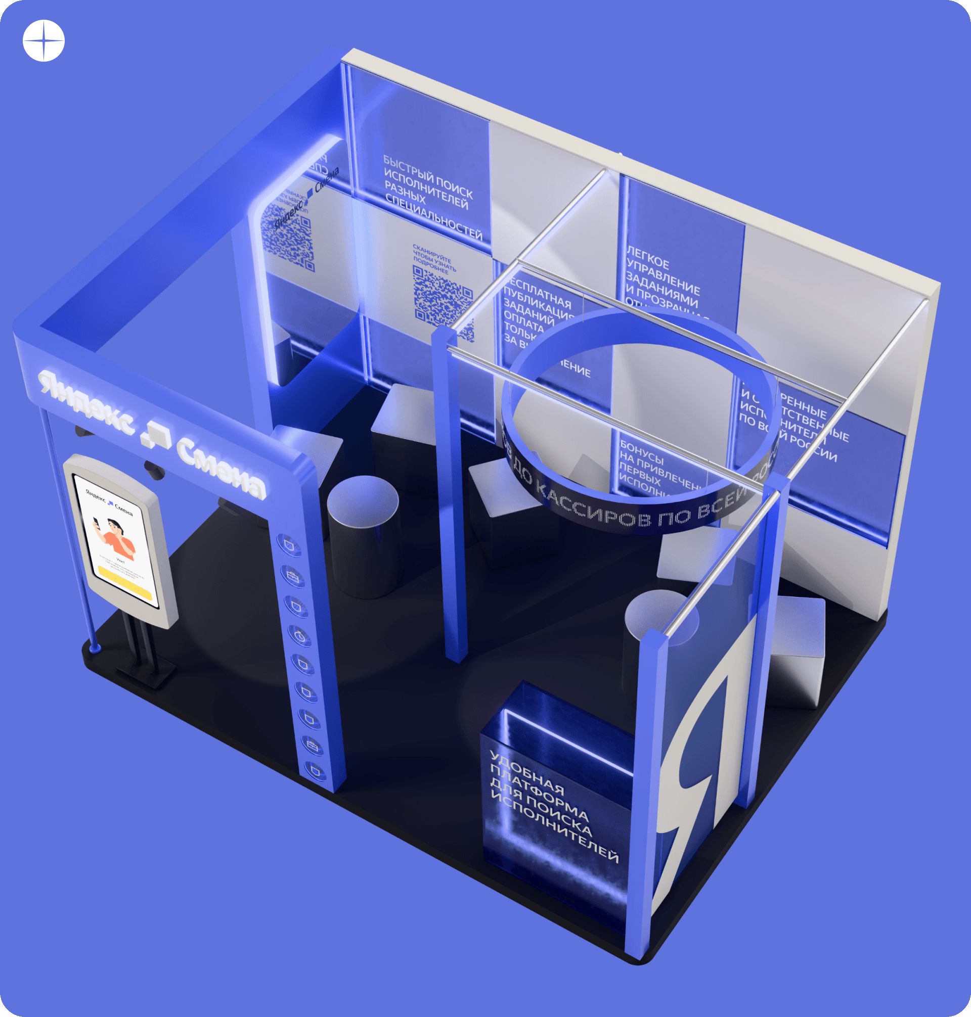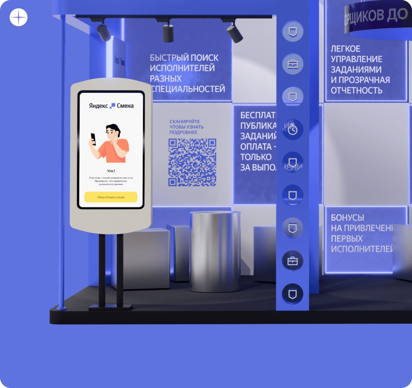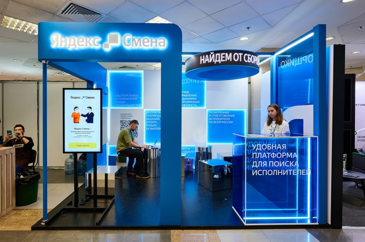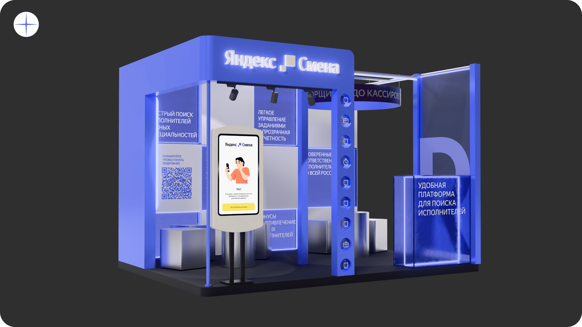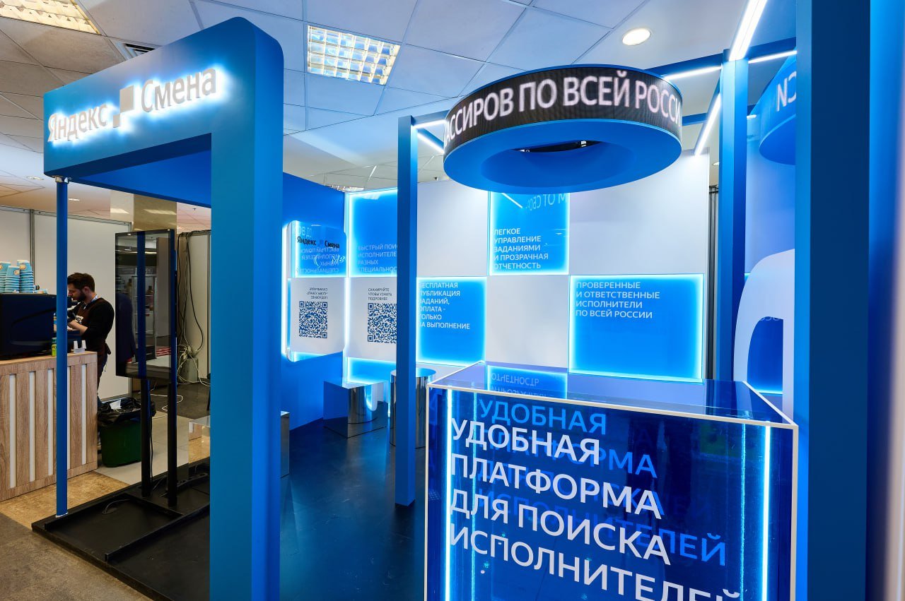Создать экспозицию, которая ярко и технологично представляет сервис «Яндекс Смена» как удобную платформу для подбора исполнителей по всей России.