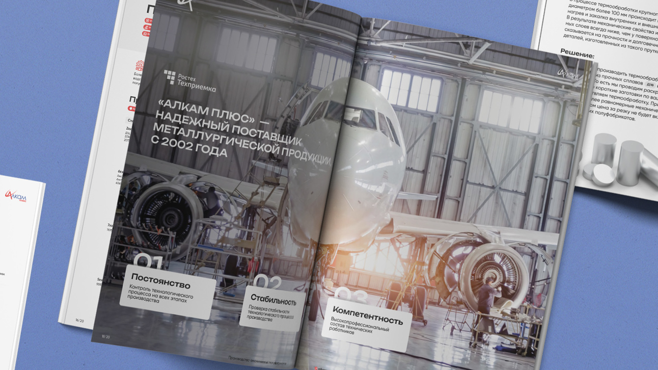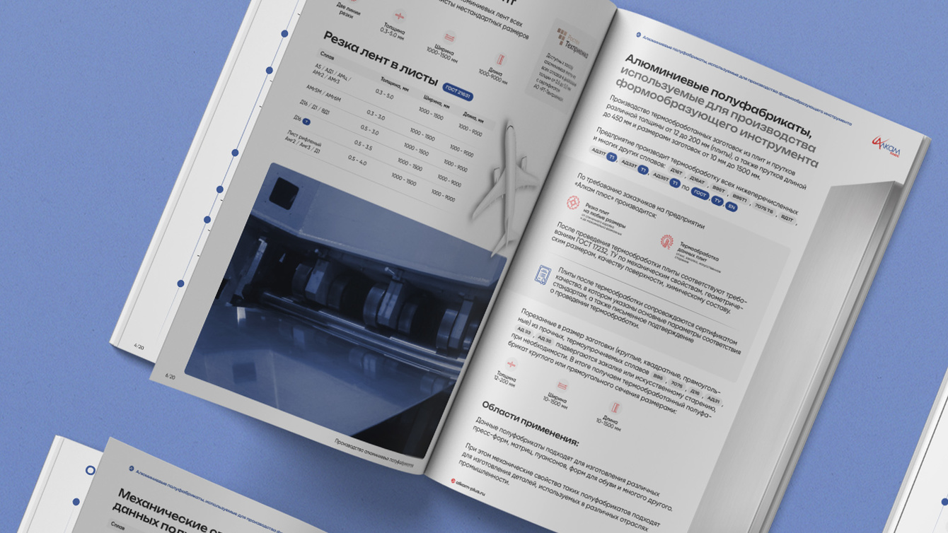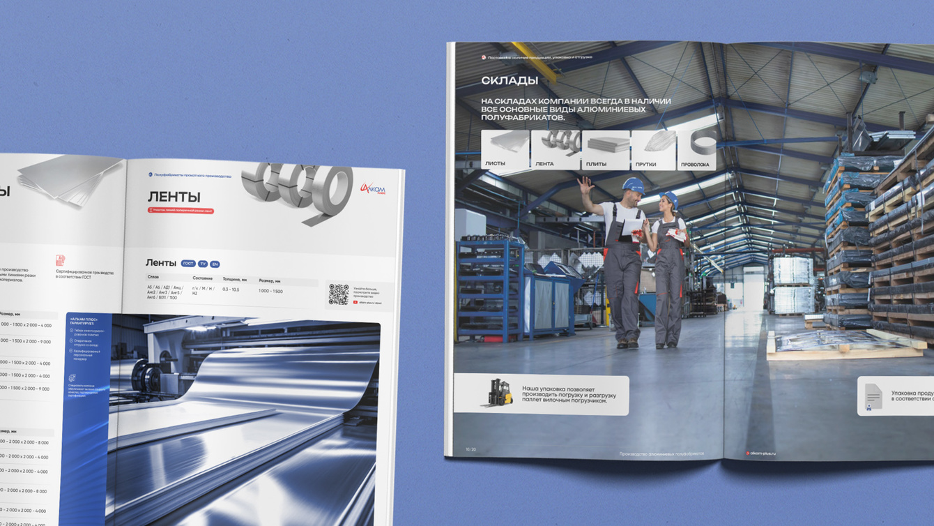 Мы разработали функциональный и визуально удобный каталог, который четко структурирует информацию о возможностях компании. В нем детально представлены все этапы работы с алюминиевыми полуфабрикатами, технические характеристики, описание производственных мощностей и гарантии качества. Новый каталог помогает клиентам быстро находить нужную информацию и облегчает процесс сотрудничества с «АЛКАМ ПЛЮС».