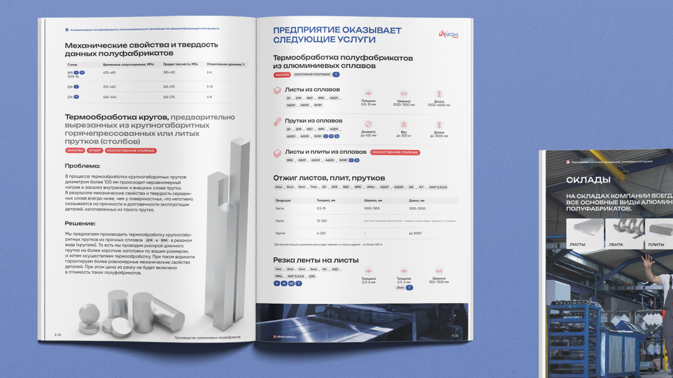Перед нами стояла задача создать современный каталог, который бы не просто демонстрировал продукцию, но подробно описывал ключевые услуги компании. Основной акцент сделан на технологии обработки алюминиевых полуфабрикатов: термообработку, резку, закалку, упаковку и складирование. Важно было представить информацию в удобном формате, чтобы облегчить клиентам выбор нужных услуг и продукции.