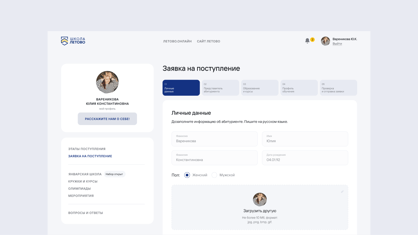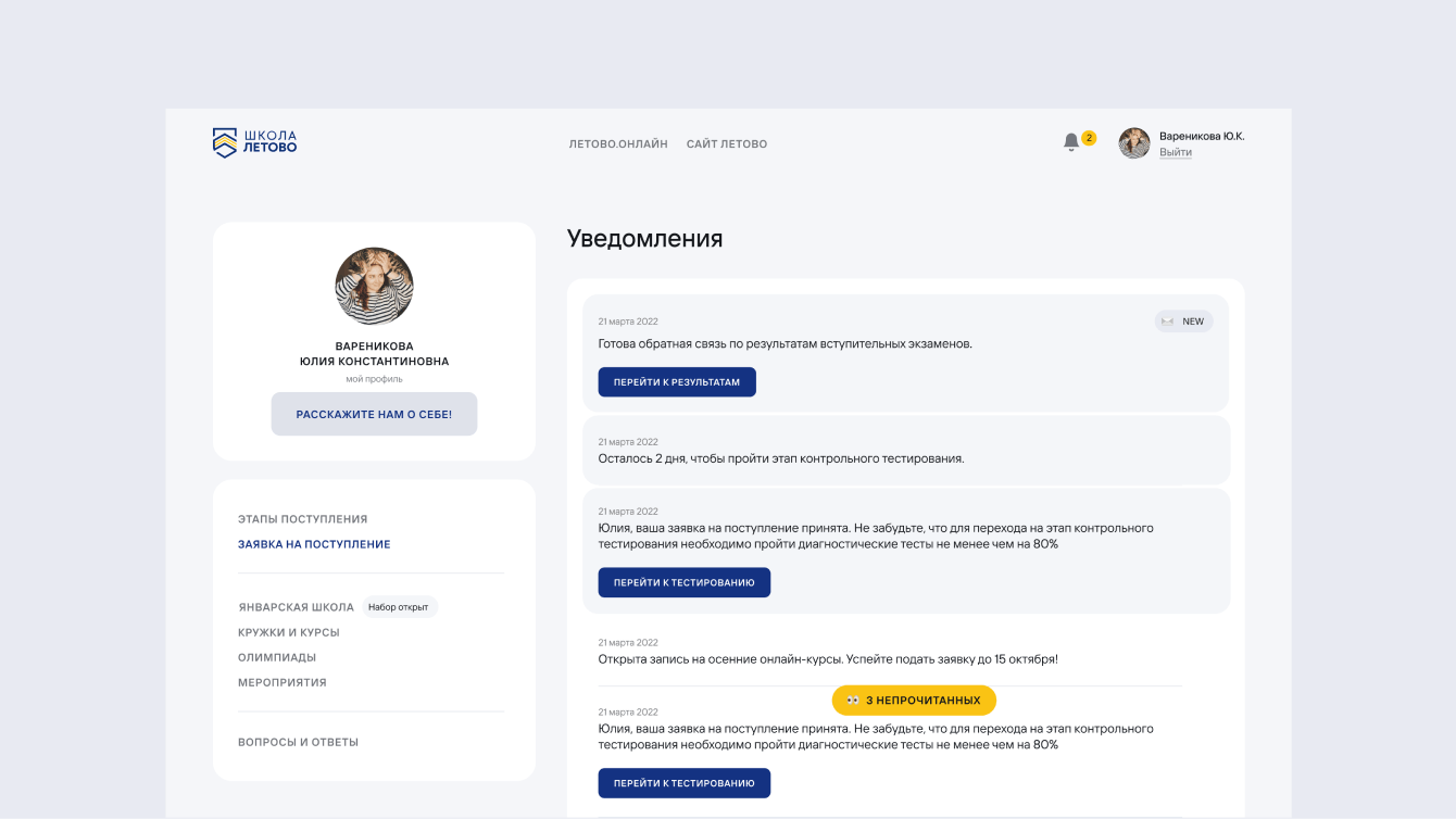 Проработали путь пользователя от регистрации в личном кабинете до подачи заявки на поступление и прохождения финального собеседования с учителями школы. Версткой и разработкой сайта клиент занимался самостоятельно.