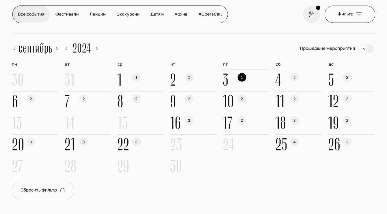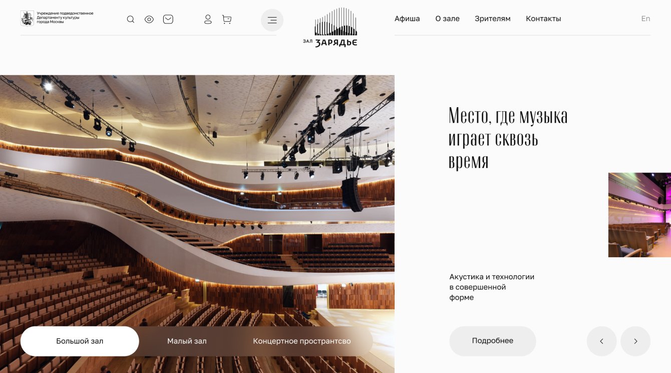 Новая структура сайта обеспечивает доступ к любому разделу в 1–2 клика. Реализована автосмена тем в зависимости от времени суток, фильтры в афише и интерактивные 3D-туры по залам.