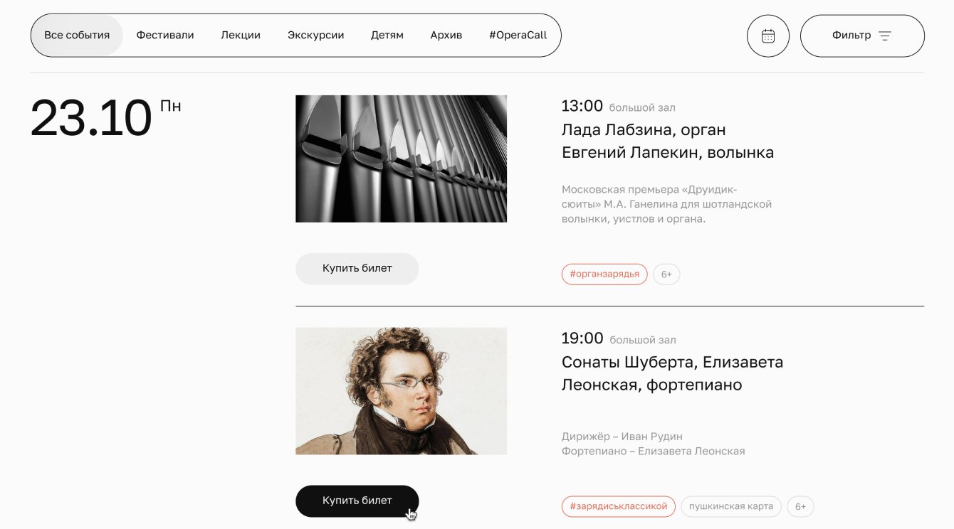 7. Информация из афиши мероприятий доступна всего в 1 клик. Для удобного поиска подходящего мероприятия в афише предусмотрены фильтры по дате, тематике и залу, а цветовое кодирование тематик помогает быстрее ориентироваться в контенте.