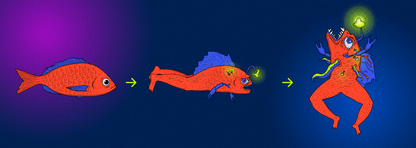 «Рыбная» тема возникла из-за названия редакции. Мы взяли рыбу и по мере продвижения вниз по лендингу превратили ее в монстра. Как в океане: чем глубже, тем более странные и пугающие существа там живут. Иллюстратор Настя нарисовала несколько вариантов мутации.