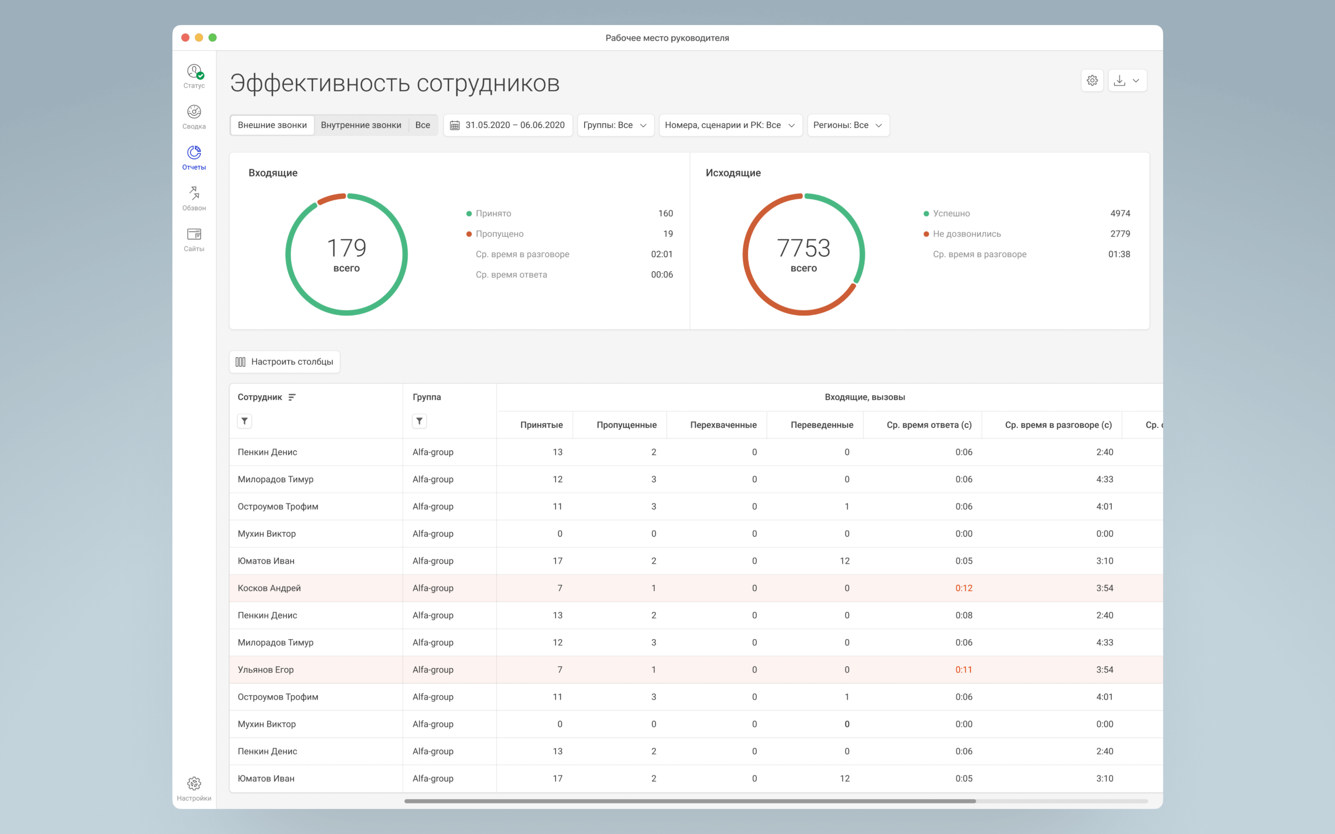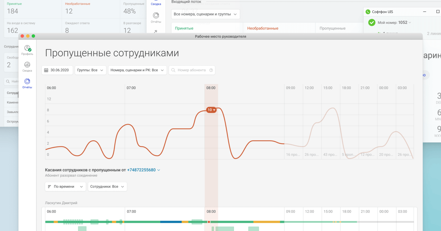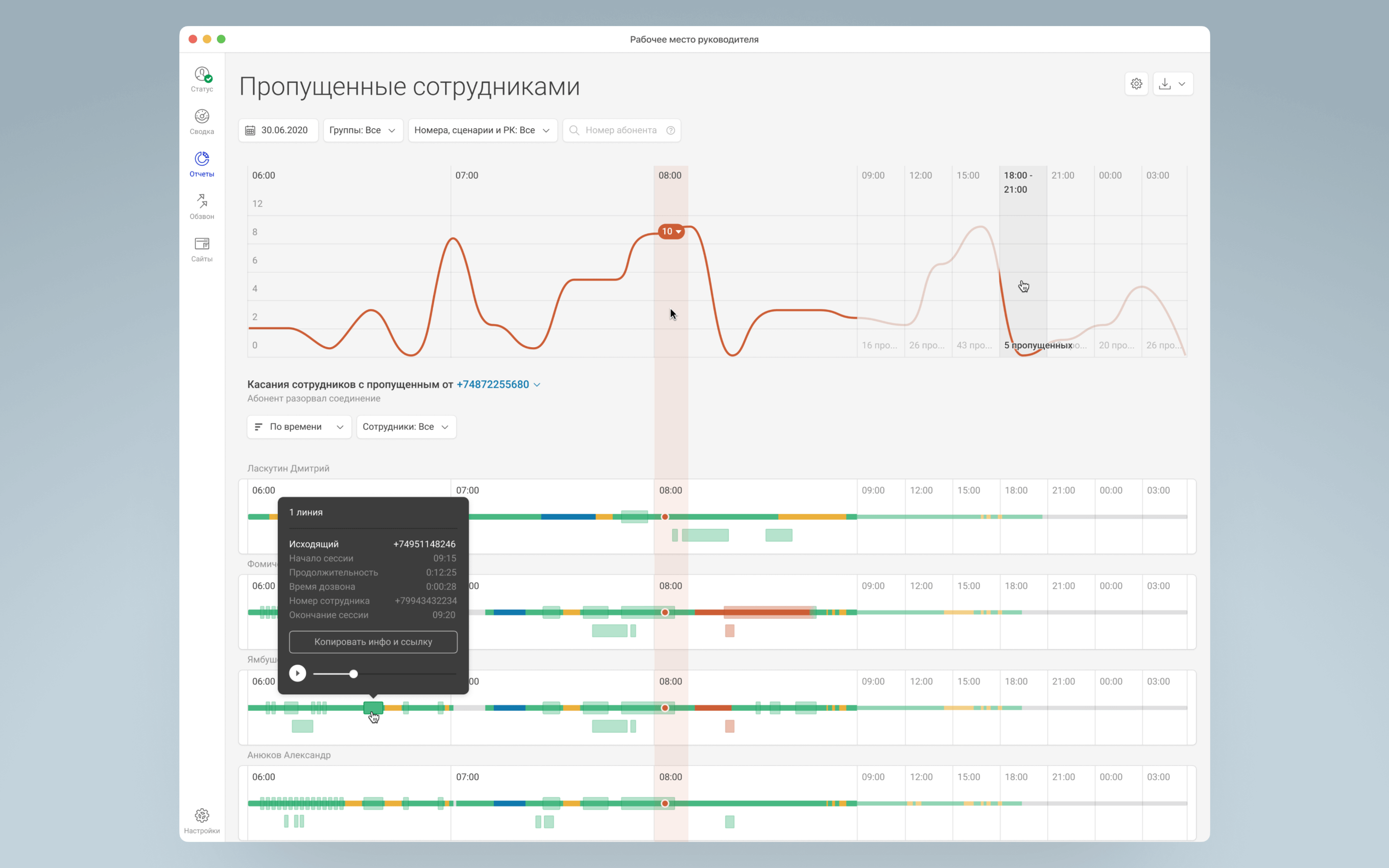 Показывает действия сотрудников в рабочее время. Здесь же у руководителей есть возможность послушать диалоги сотрудников и поделиться записью с коллегами прямо из интерфейса.