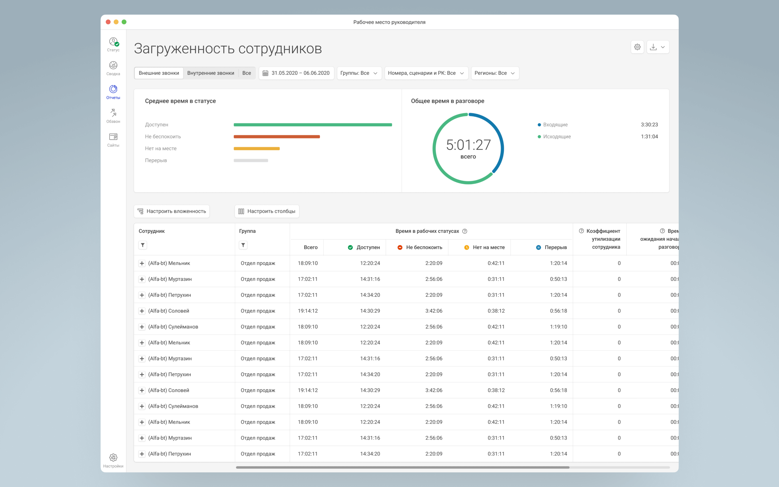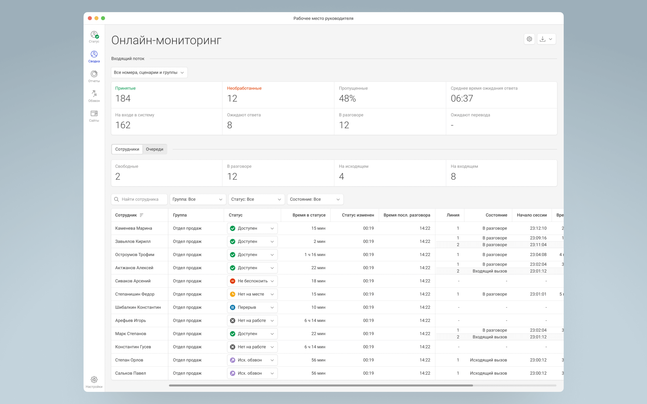 Отображение ситуации на линии в моменте: кто из сотрудников находится в разговоре, кто ушел на перерыв, сколько клиентов ждут ответа и сколько по времени. При большом потоке обращений можно вручную поменять статус менеджера и вывести его на линию.