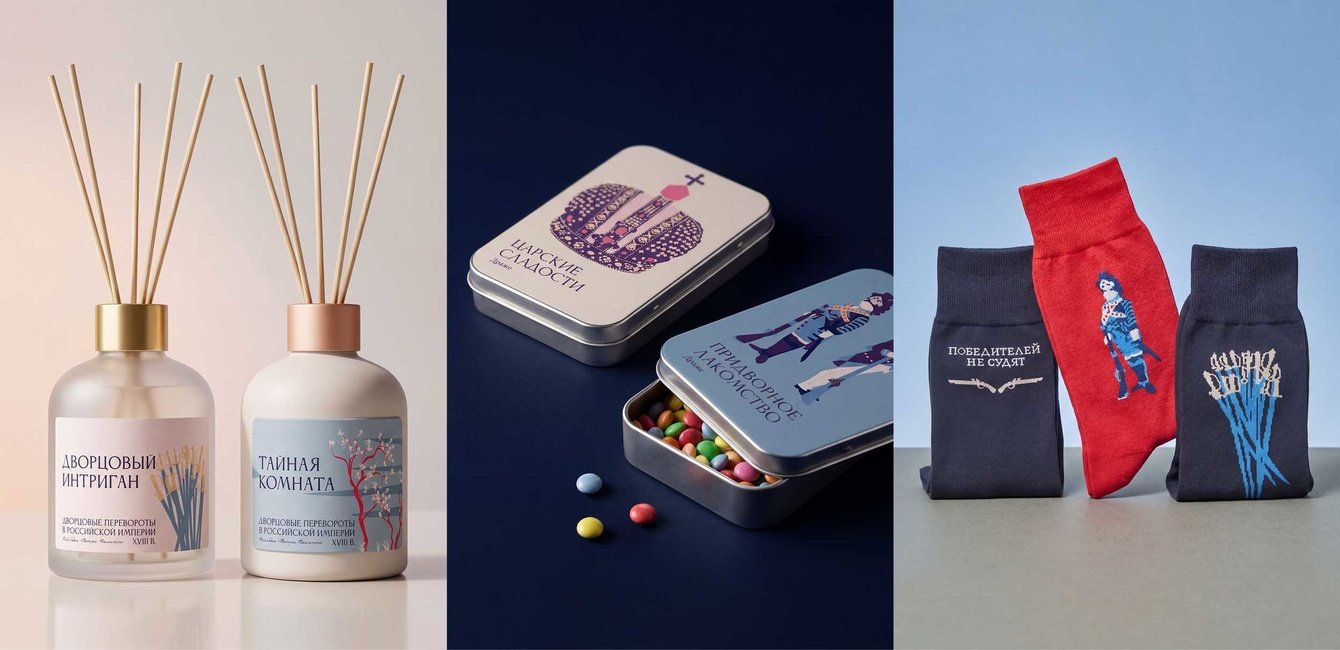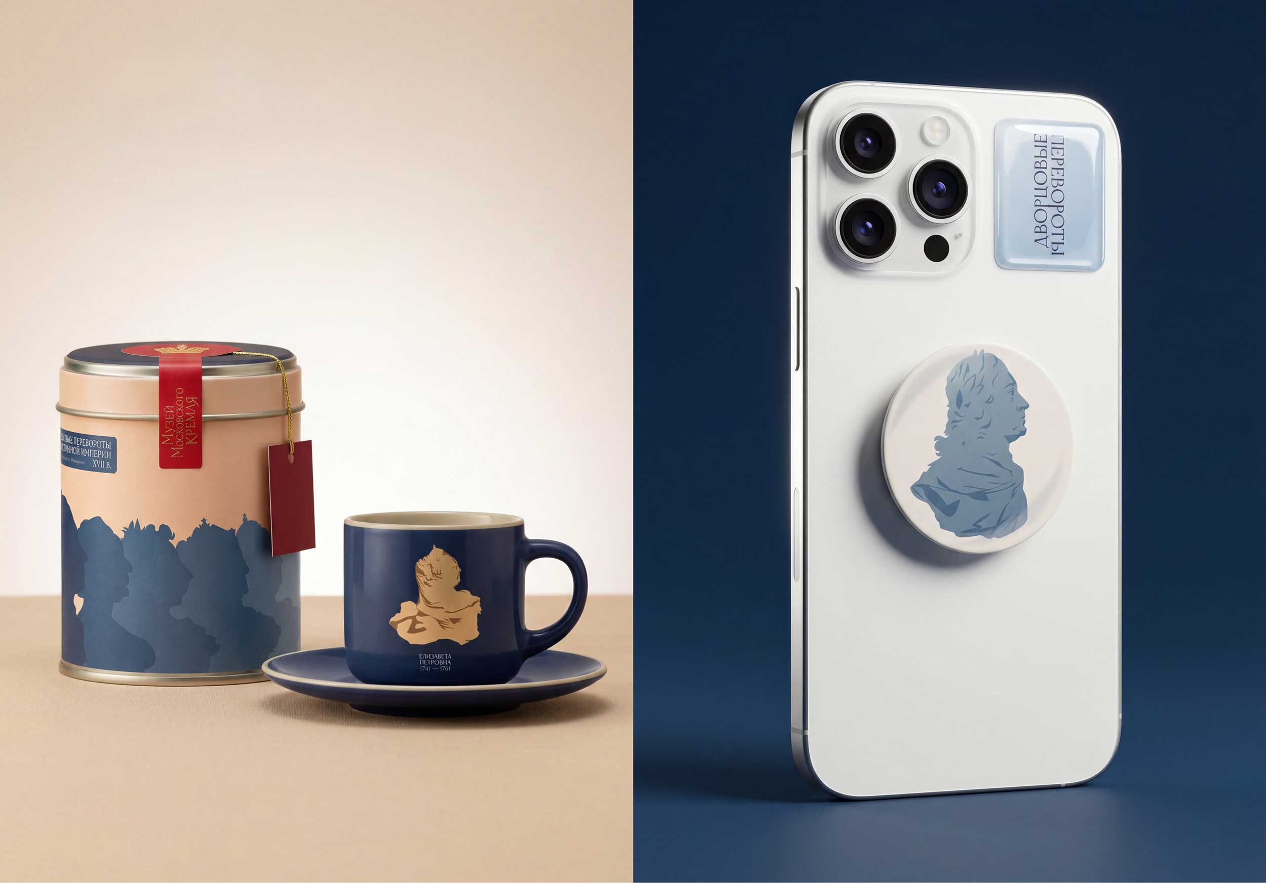 Перед нами стояла задача разработать концептуальное визуальное направление для сувенирной коллекции, посвящённой эпохе дворцовых переворотов. Важно было переосмыслить историческую тему и уйти от академической подачи, сделав её более живой, интригующей и привлекательной для современной аудитории.