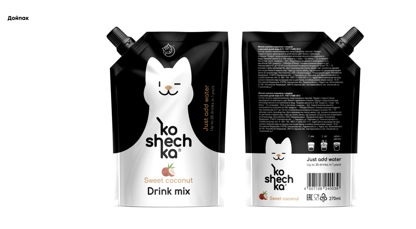 Мы предложили очень удачное решение. В результате адаптации концепции получили линейку из 3х СКЮ с под разные вкусы. Иллюстрация хорошо легла на разные форматы подачи продукта, при этом нестандартное для категории чёрно-белое решение будет выделять продукт на полке, формируя единый бренд блок.