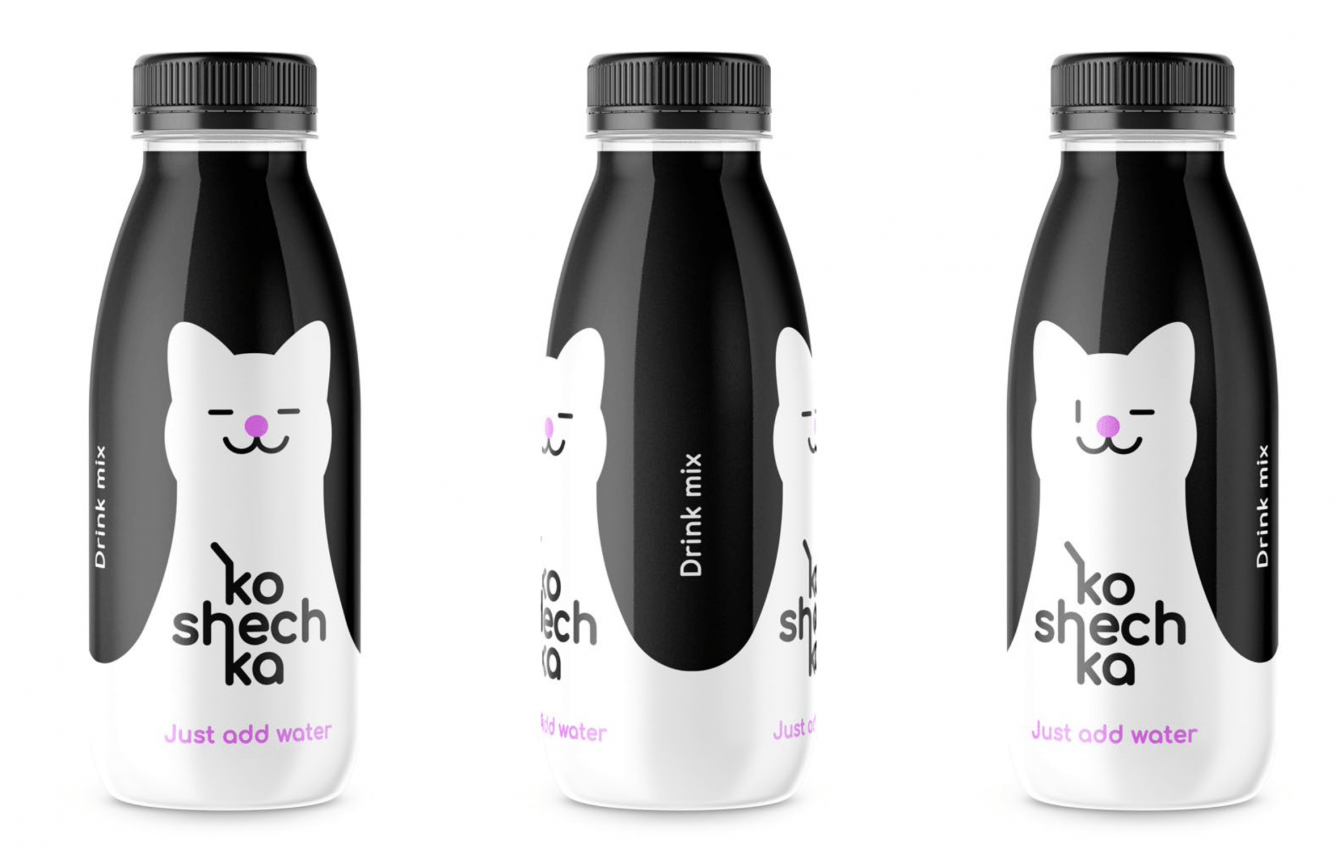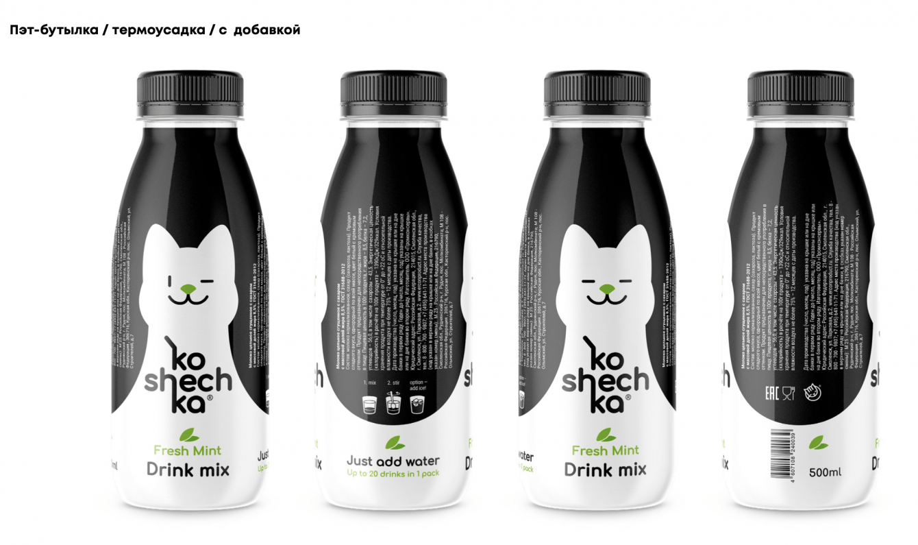 За визуальную основу мы взяли символ инь-ян, показав единство двух стихий — черное и белое. Как в графике, во взаимодействии двух стихий создается что-то новое: фигура кошечки-маскота, так и напиток, во взаимодействии с водой рождает новый, необычный коктейль.