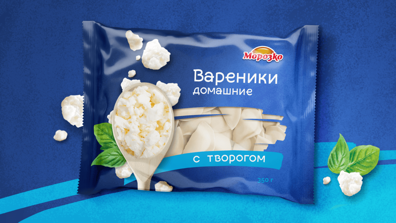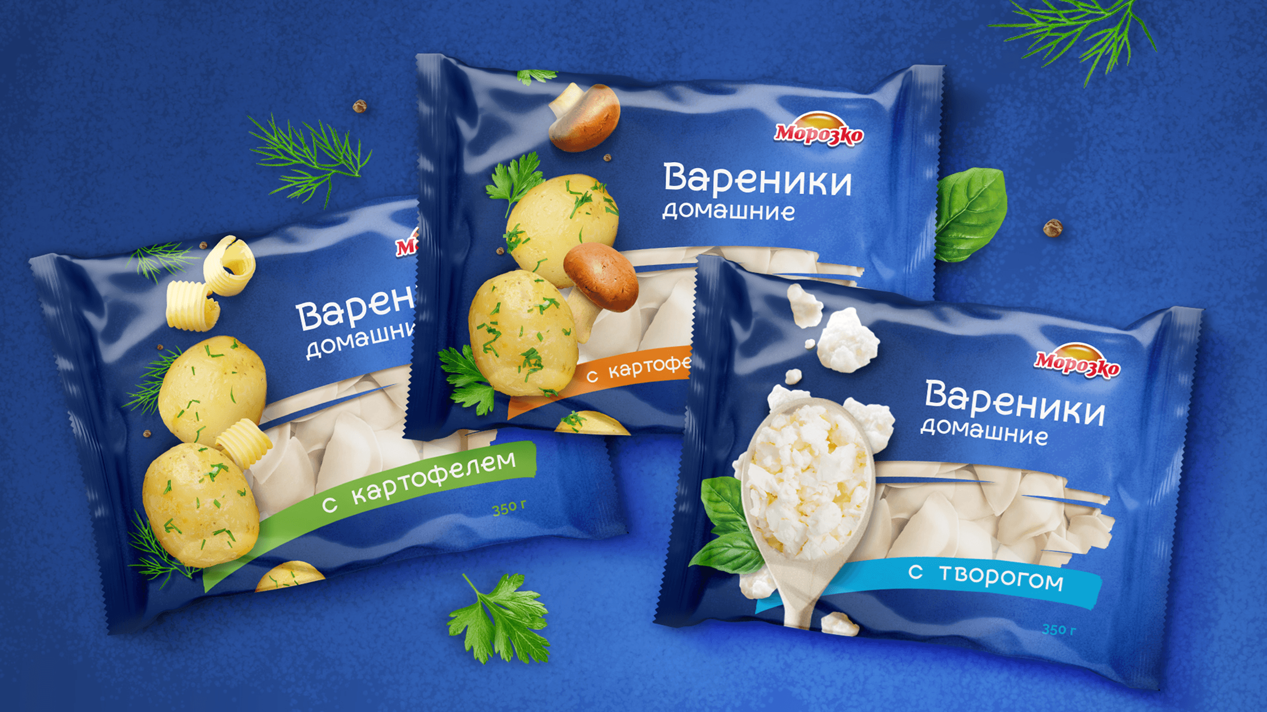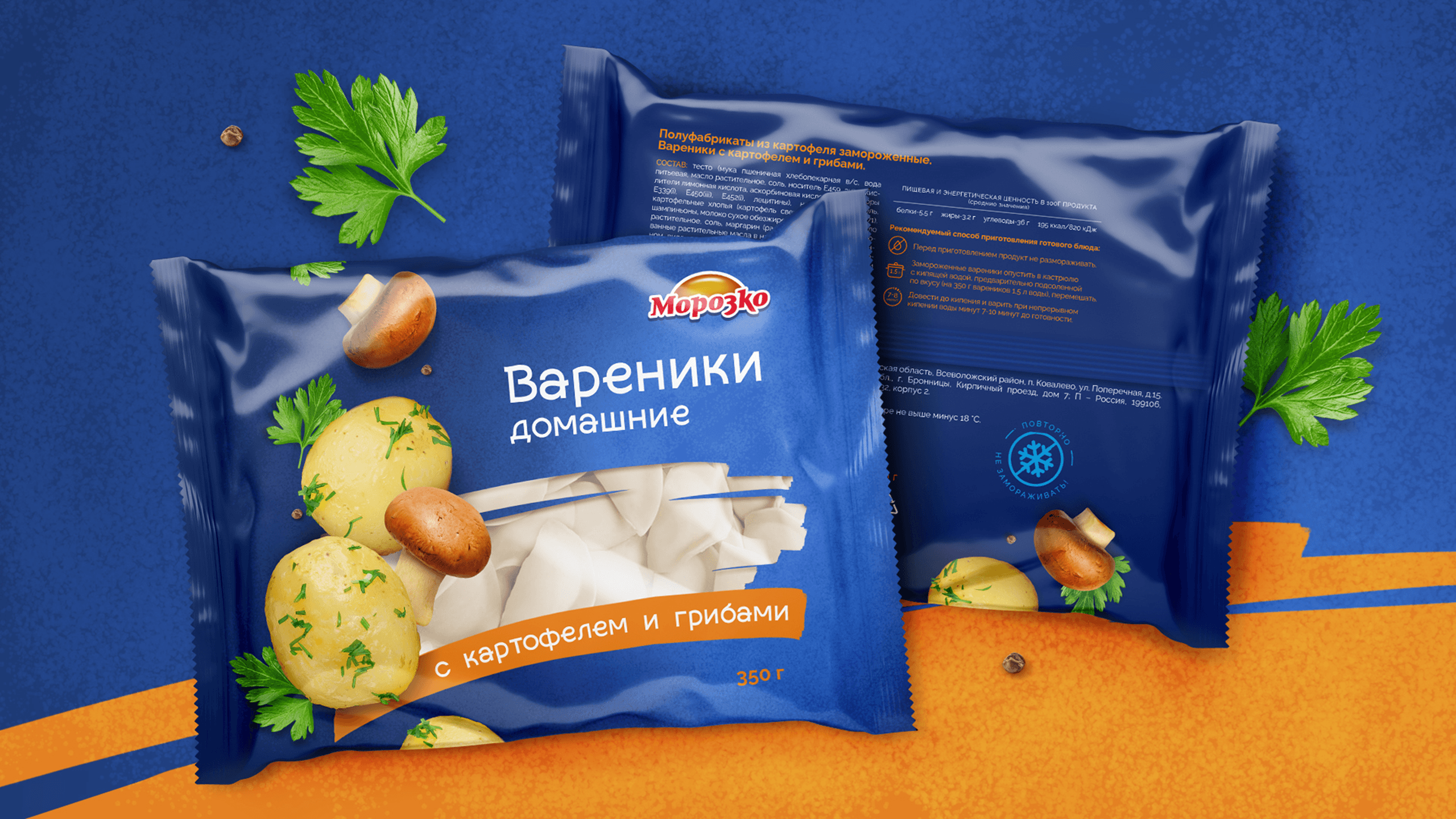 Разработать упаковку для высоко конкурентного сегмента, в котором марка раньше не была представлена. Сохранить узнаваемый характер бренда, однако отойти от классического его толкования. Вареники Морозко – вкусный традиционный продукт для занятых горожан, важно было, чтобы они выглядели современно и соответствовали образу жизни аудитории.