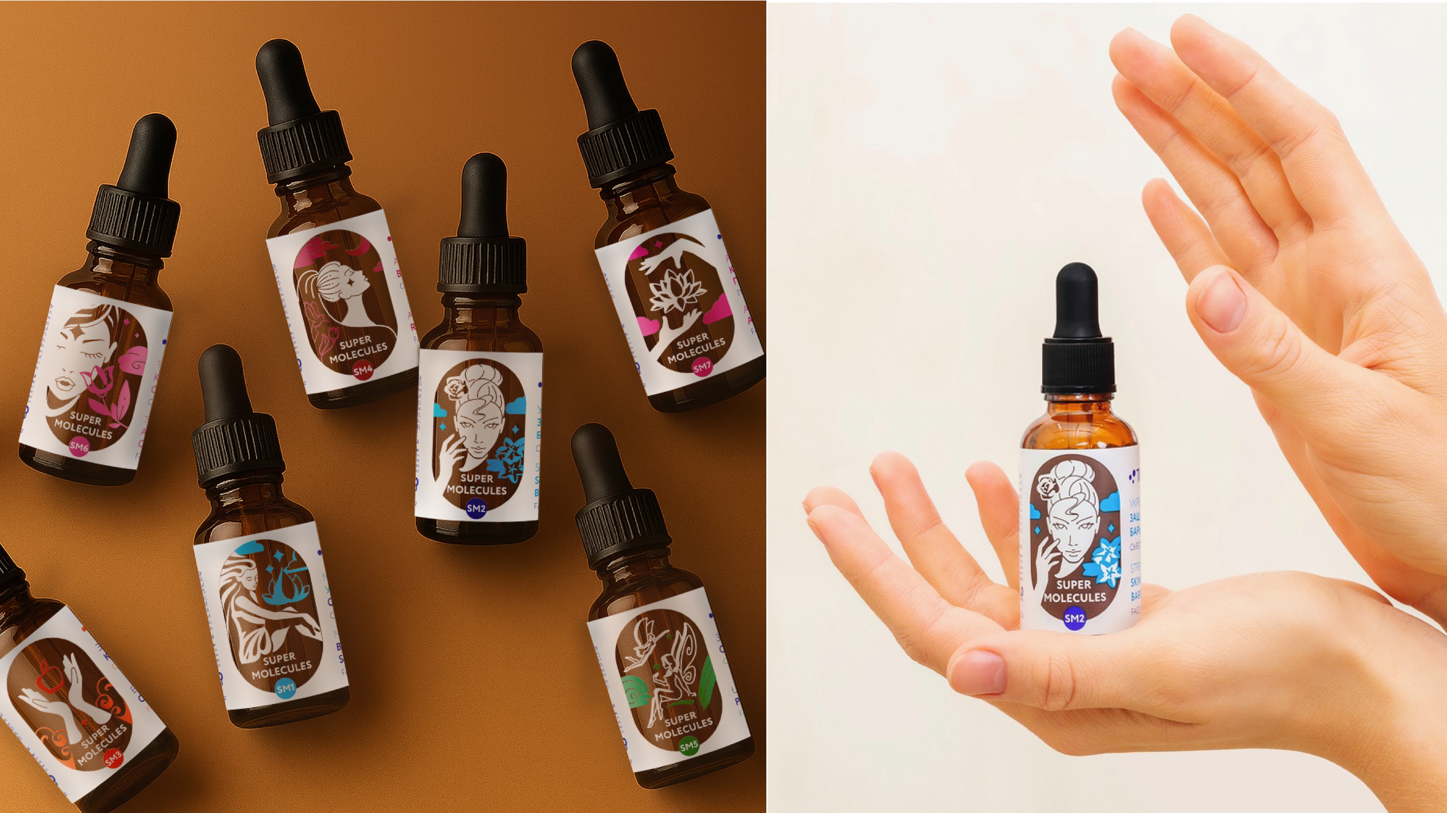 Дизайн линейки Super Molecules создавался в рамках ранее утвержденной стратегии бренда и транслирует единый образ графического решения. Для этой цели была разработана серия иллюстраций, которые использовались также в дизайне сайта. Коробки выполнены при помощи печати на металлизированном картоне, что усиливает эффектность иллюстраций.