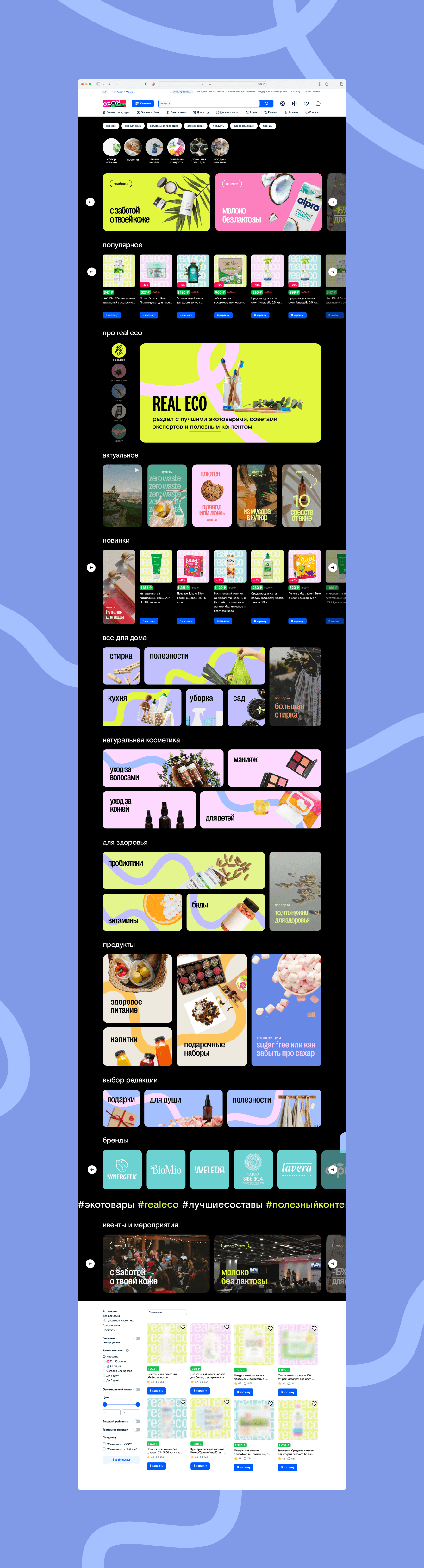 В основу разработки страницы взяли сторителлинг, который органично сочетается с карточками товара. Так контент стал частью витрины и позволил покупателю получить больше информации о товарах, брендах и разумном потреблении.