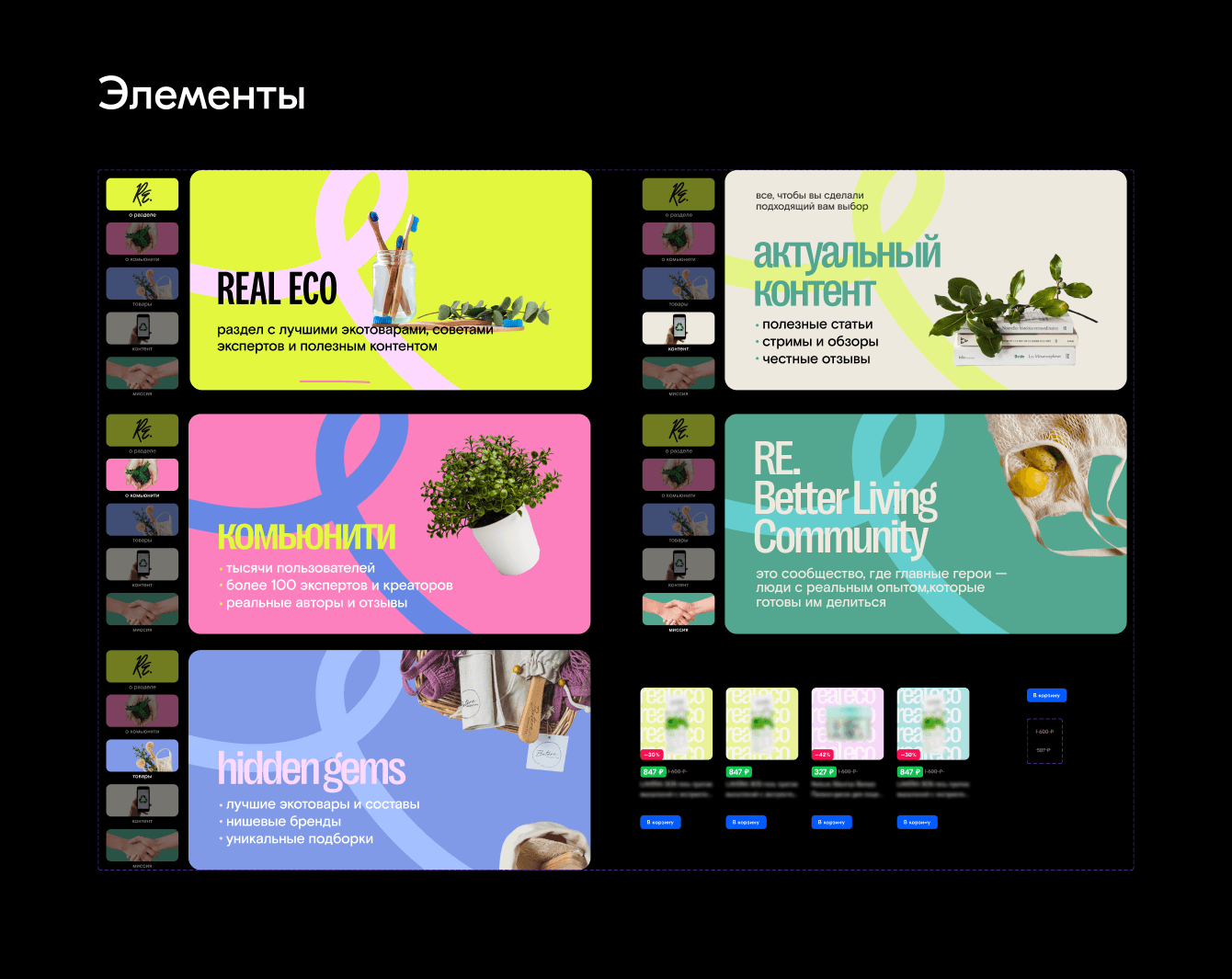 Отдельно проработали ключевые элементы витрины: обложки для разделов, оформление хештэгов и отображение карточек.