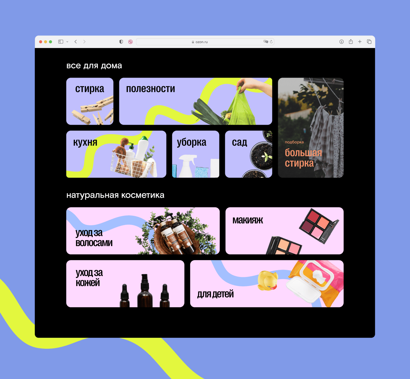 В дизайне использовали нетипичную для OZON верстку и яркие цветовые решения. С помощью контрастных ярких цветовых решений мы создали уникальный и запоминающийся стиль.