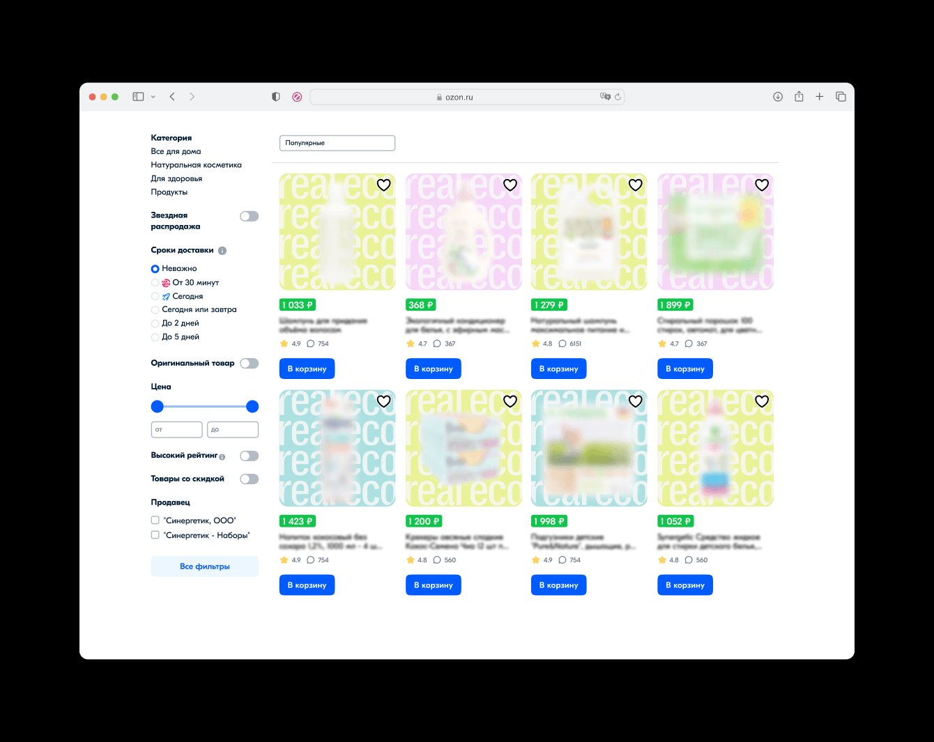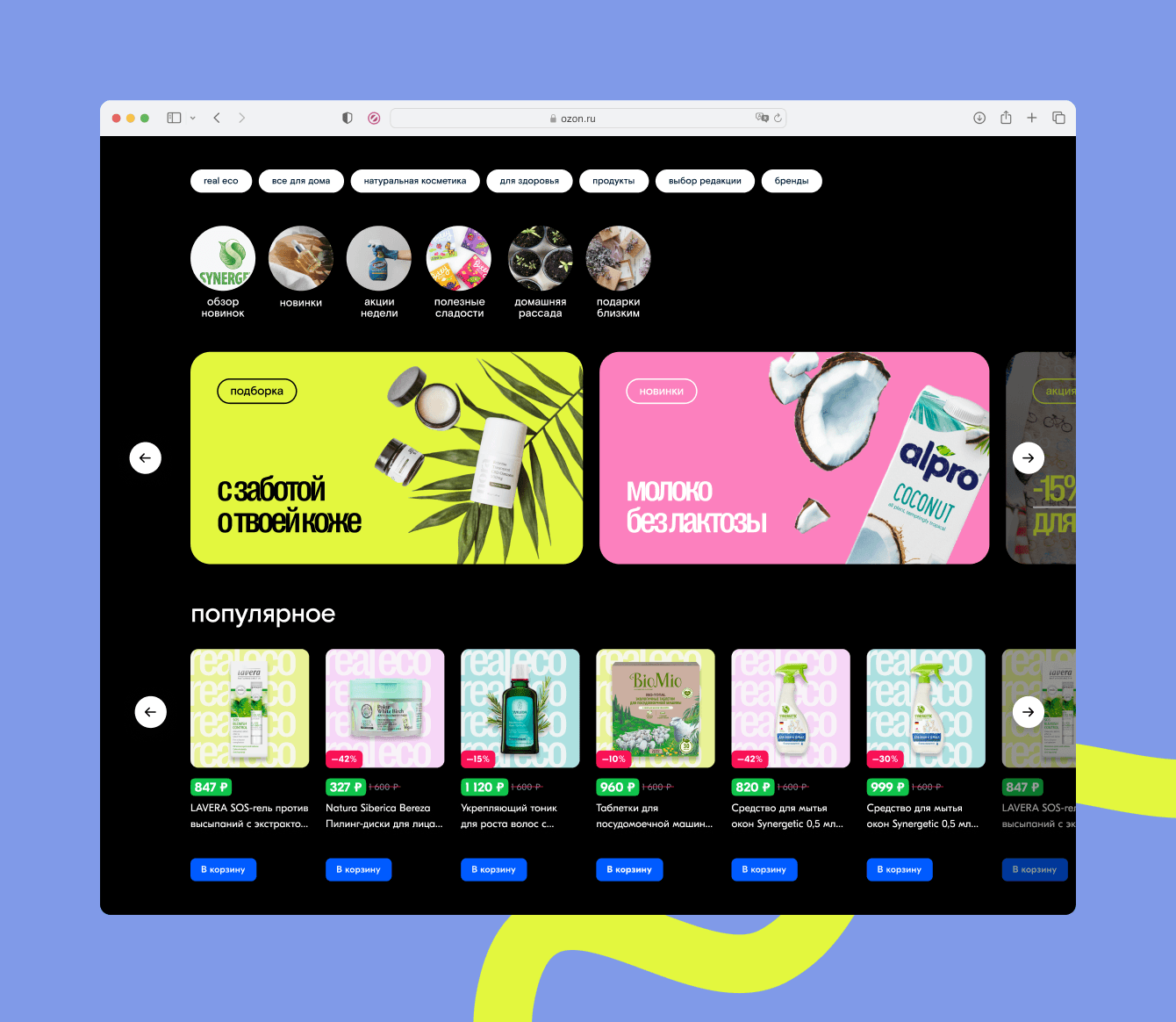 Наиболее сложным вызовом проекта стала необходимость органично вписать эко-раздел в общий UI одного из крупнейших страны — Ozon.
