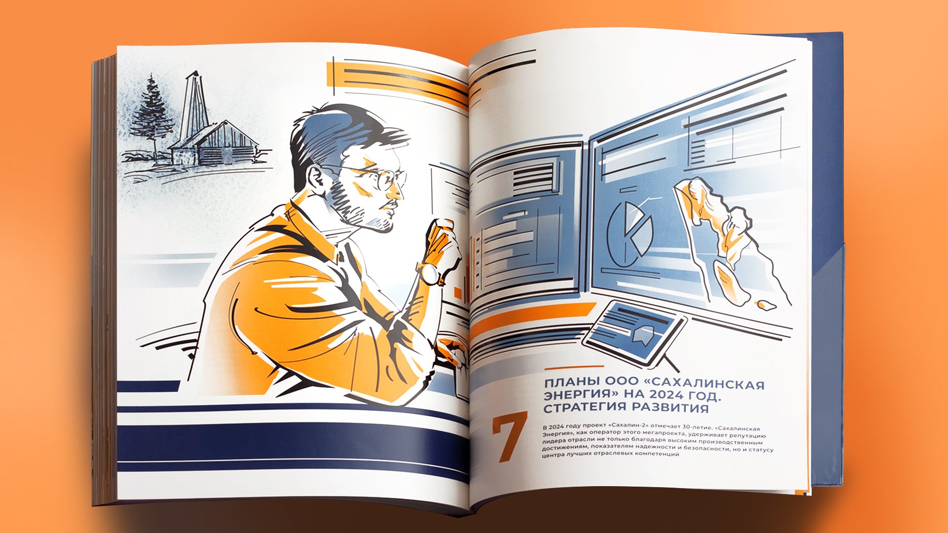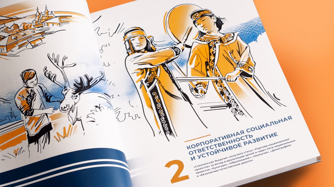 В основе дизайн-концепции — расположенные на шмуцтитулах коллажи, которые выполнены в броской графической манере и в которых исторические мотивы освоения Сахалина соседствуют с современными объектами, иллюстрирующими деятельность компании «Сахалинская Энергия».