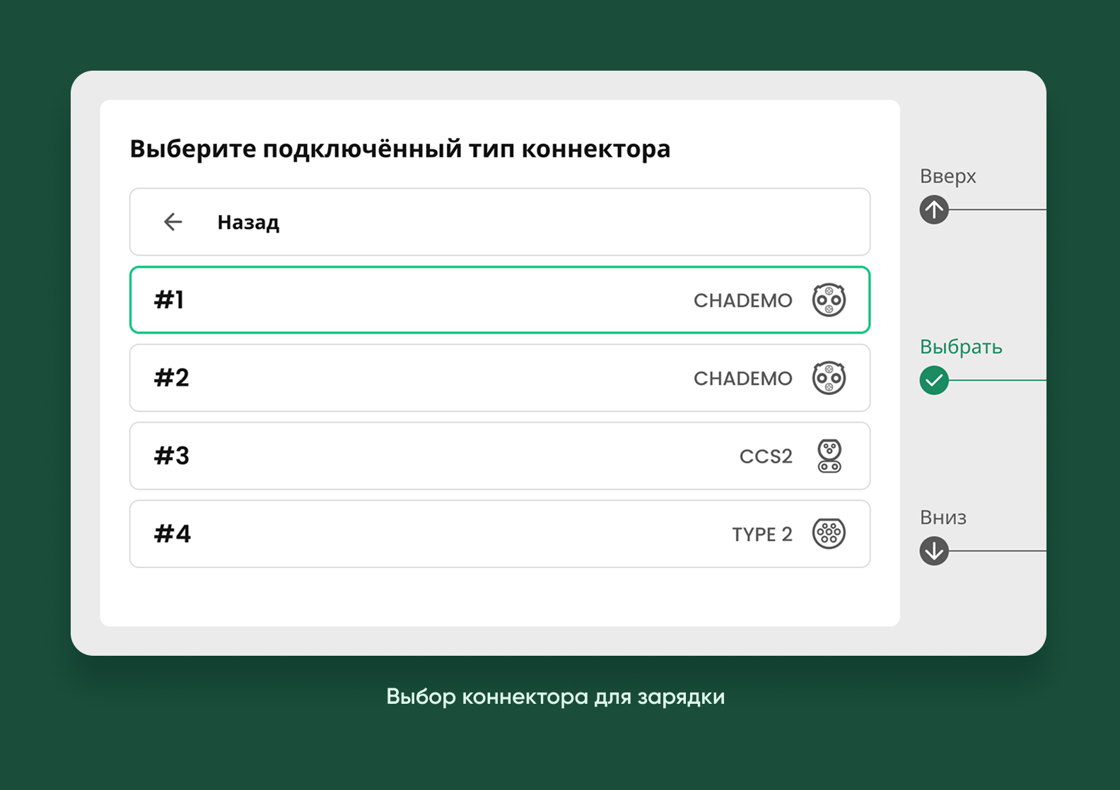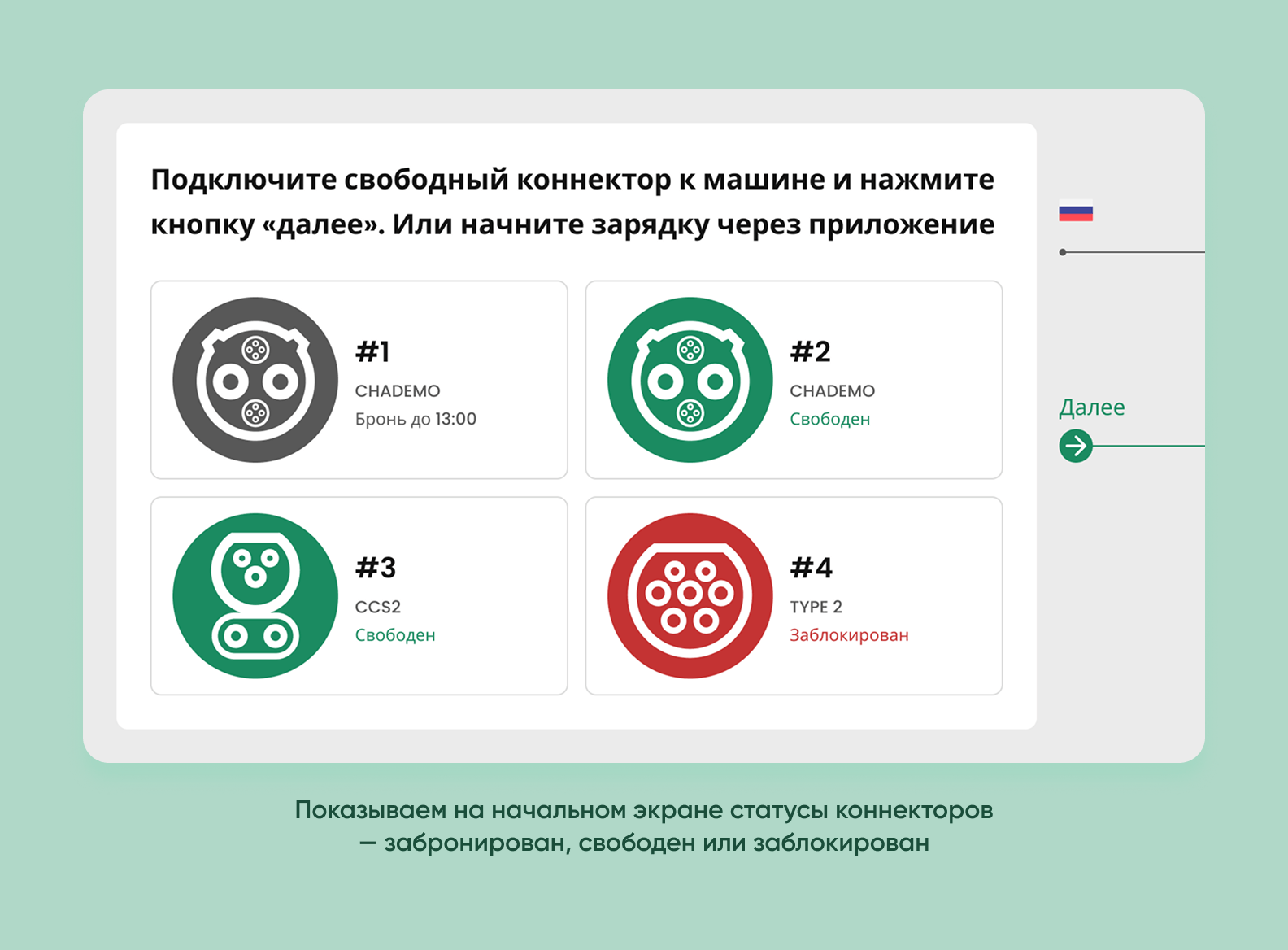 Задача, которую поставили перед нами «Яблочков» — проработать систему управления интерфейсом и продумать удобный для пользователя UX-сценарий, учитывая ограниченные способы взаимодействия. Меню должно было быть простым и интуитивным: чтобы пользователь мог без затруднений выбрать язык, авторизоваться, выбрать тип коннектора и отслеживать прогресс зарядки.