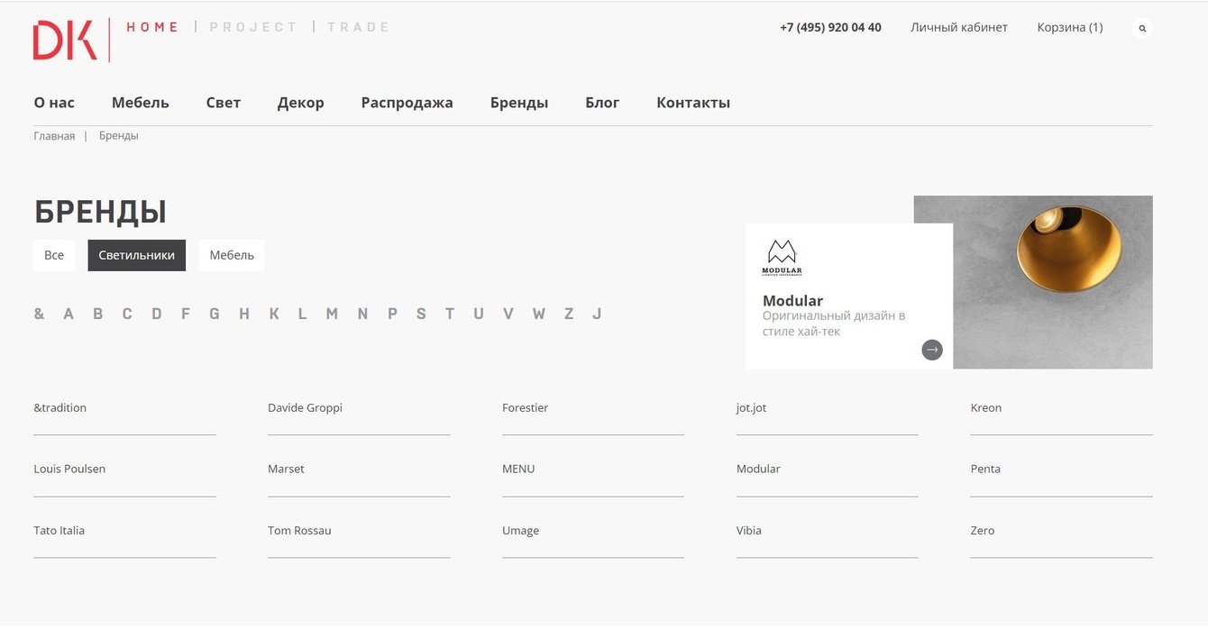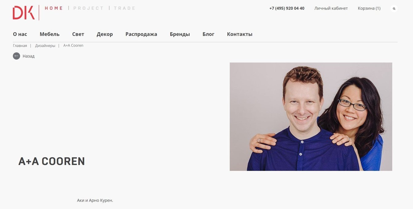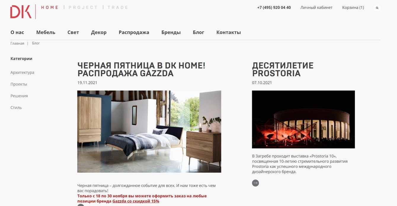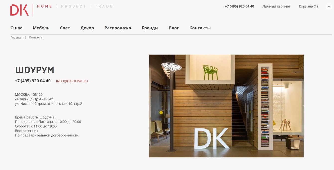 Группа компаний DK более 15 лет поставляет дизайнерскую мебель и освещение для коммерческих и частных проектов. Стремление к развитию, совершенствованию сервиса и следование тенденциям интерьерного рынка привели к созданию нового направления- DK Home. DK Home – это шоу-рум мебели и предметов интерьера от ведущих скандинавских и итальянских брендов, а также молодых европейских дизайнеров. Для развития нового направления потребовалось создание сайта. Перед нашими разработчиками были поставлена задача сделать современный и удобный сайт для привлечения клиентов в оф-лайн шоу-рум и получения лидов в CRM заказчика с акцентом на товар (качественные фото, детально проработанная карточка товара), функционалом интернет-магазина (возможность оформления заказа на сайте, личный кабинет) и интеграцией с 1С и CRM.