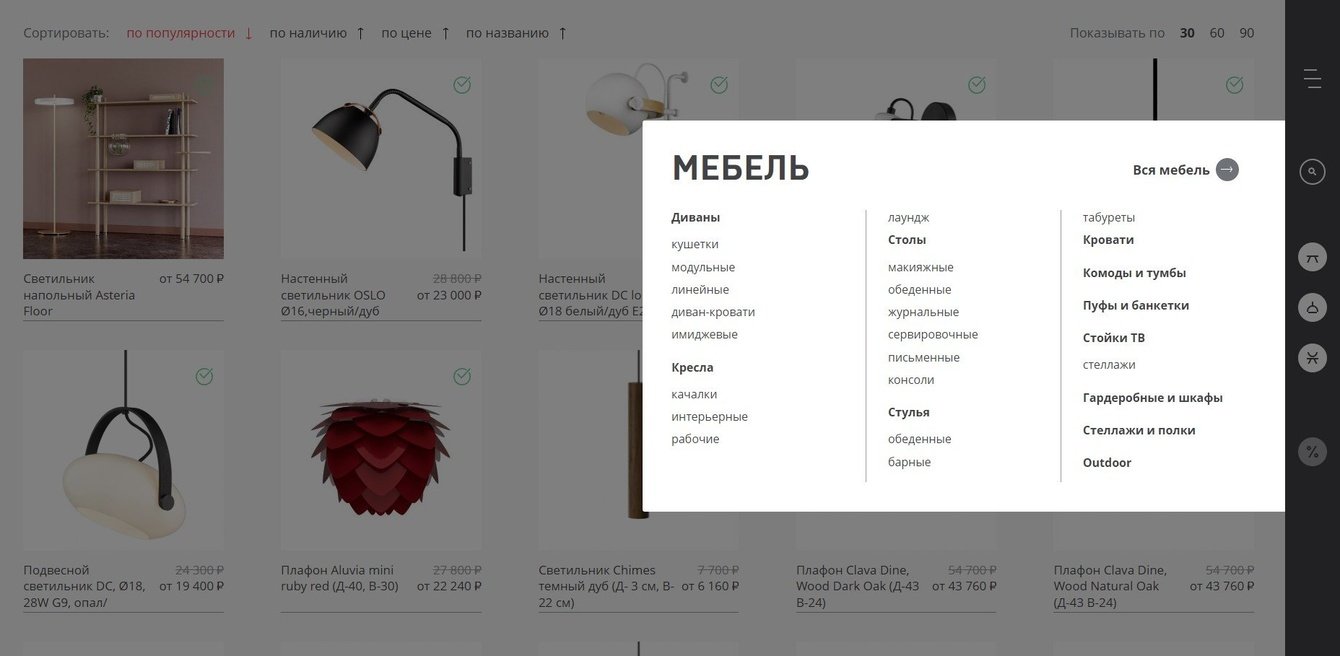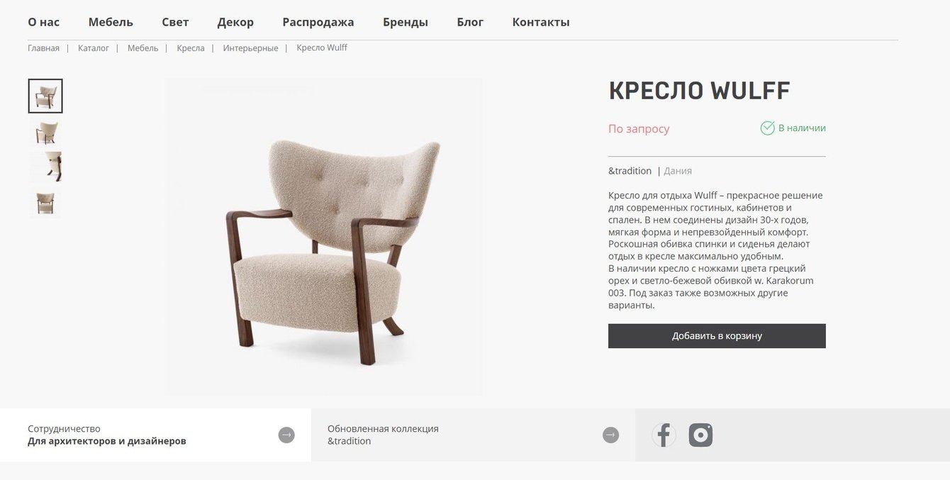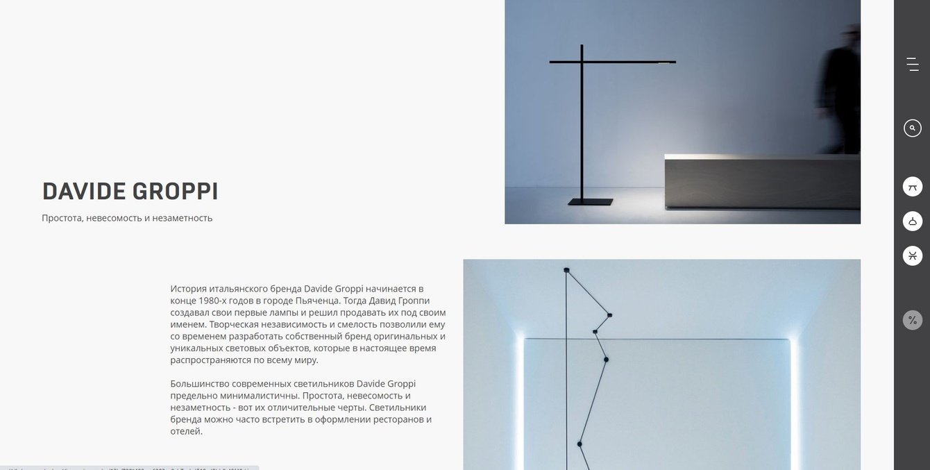 При составлении дизайн-проекта сайта были использованы элементы фирменного стиля компании. Дизайн соответствует представлению о компании – уникальные интерьерные решения для работы и отдыха. Особое внимание было уделено отрисовке страниц каталога, а также разработке большого подробного фильтра. Каждый раздел сайта имеет уникальный дизайн и интерфейс для удобного подбора и просмотра каталога. Карточка товара содержит не только фото, характеристики и цену, но и описание предмета, информацию о дизайнере, фотографии других предметов интерьера из этой коллекции. Настроены фильтры по бренду, цене, коллекции и дизайнеру, реализован поиск по сайту. Была разработана удобная плавающая навигационная панель с быстрым доступом к каталогу и отображением полной структуры сайта. В блоке "Бренды" содержится перечень всех представленных в каталоге дизайнеров с разбивкой на коллекции.