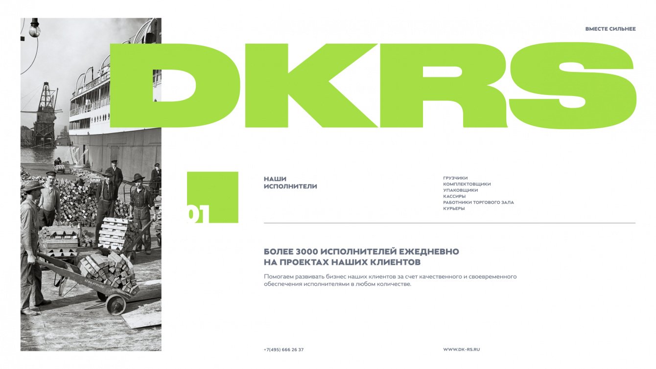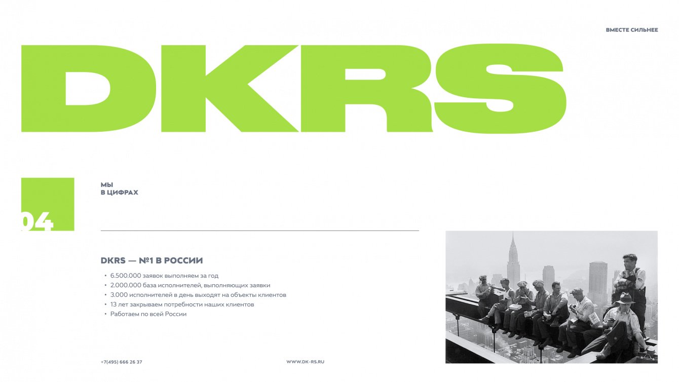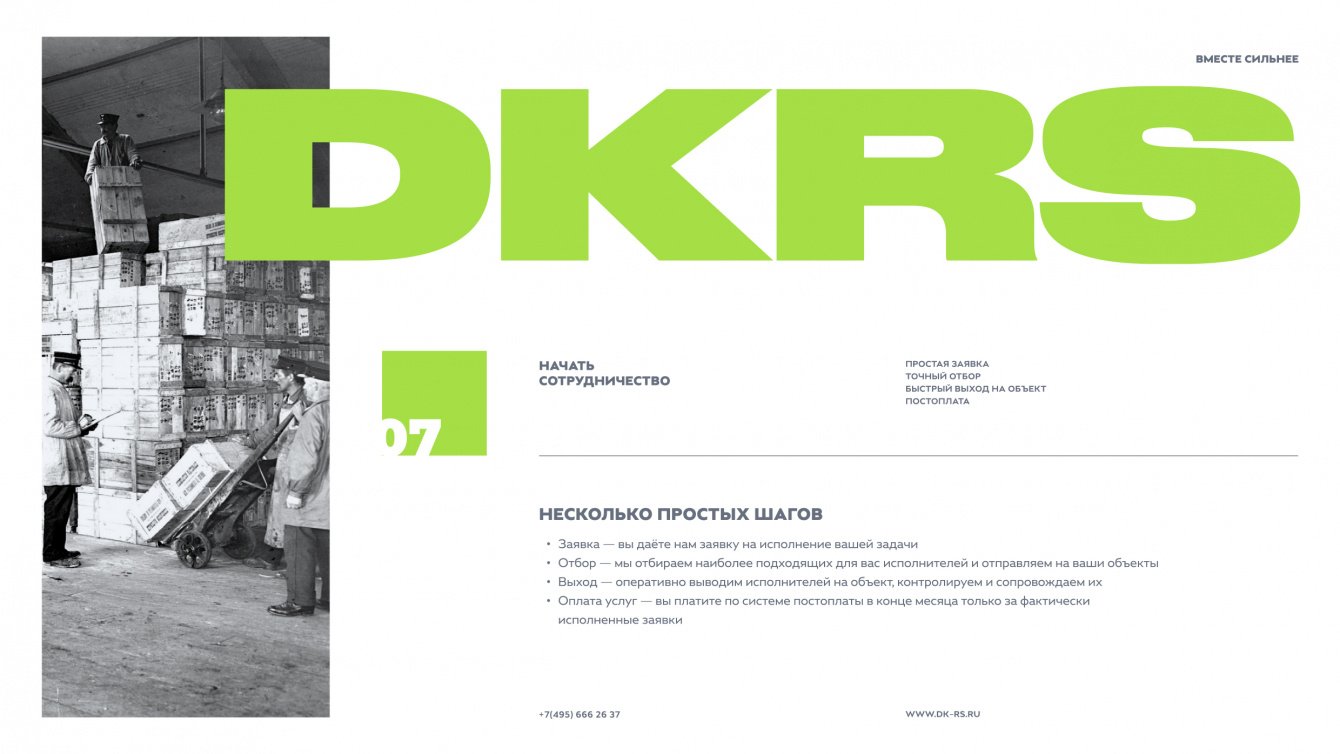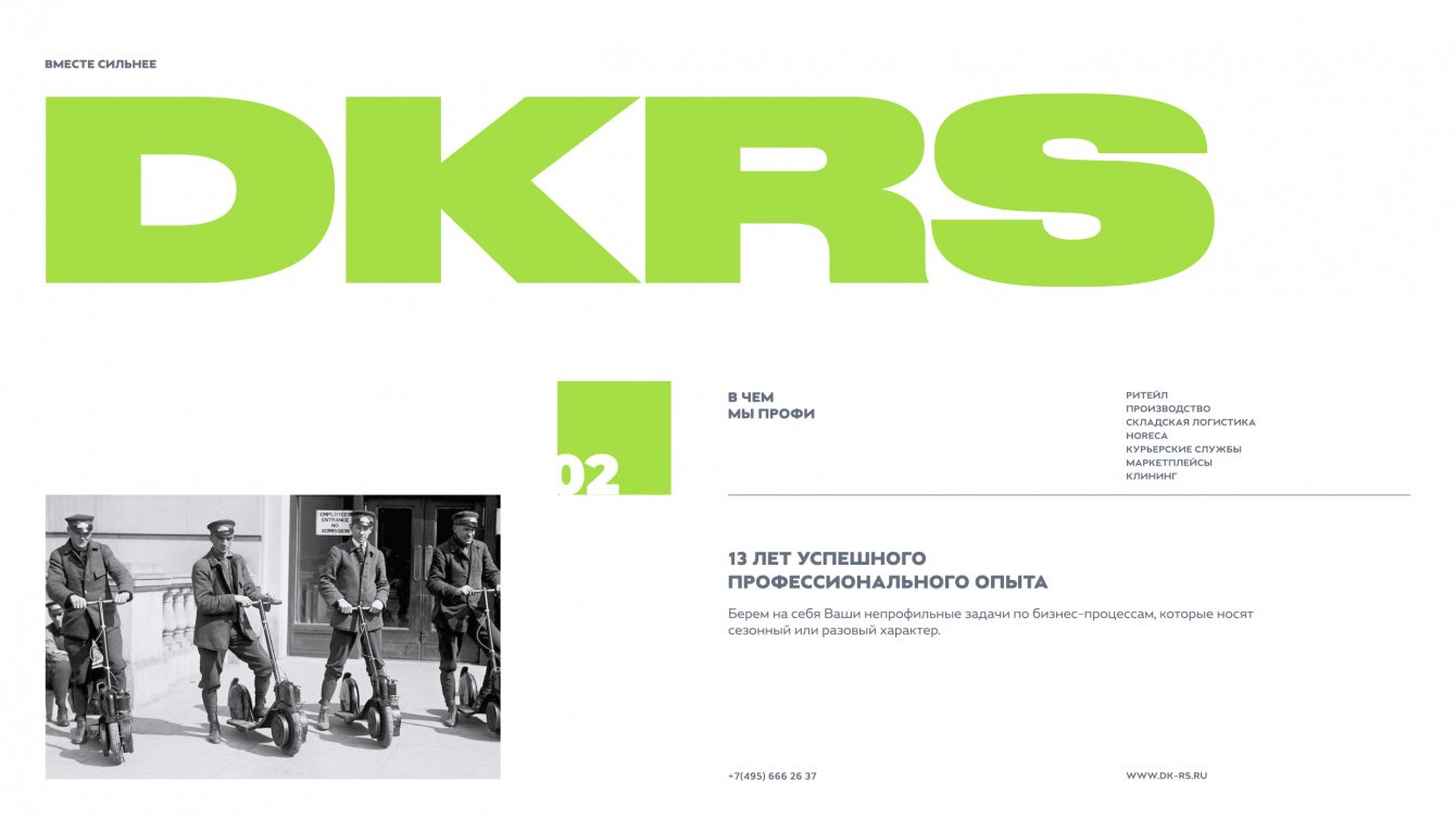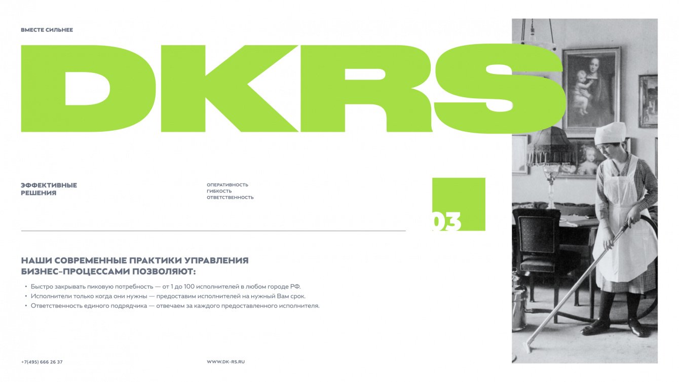 DKRS — агентство по подбору непрофильного массового персонала. Задачей проекта было создание корпоративной / рекламной презентации с новой айдентикой и нестандартными визуальными решениями. Презентация предназначалась для рекламных email рассылок, а также для отправки клиентам и контрагентам.