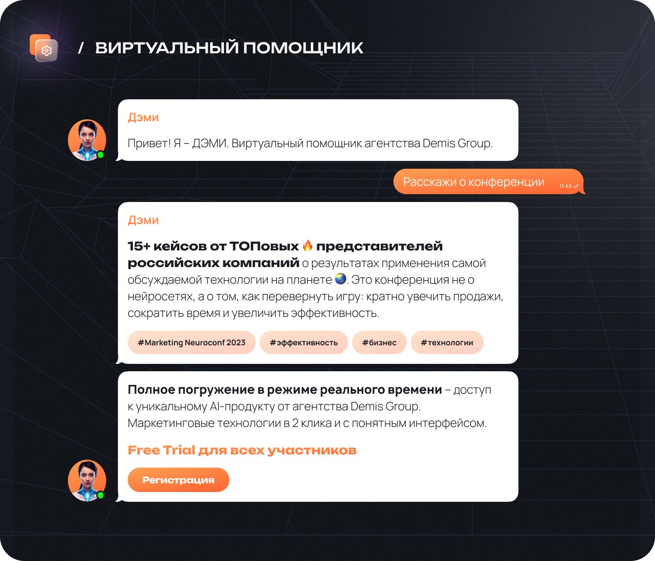 Основной идеей проекта стало создание лендинга на базе диалога между нейросетью Деми и Основной идеей проекта стало создание лендинга на базе диалога между нейросетью Дэми и посетителем для передачи информации о предстоящем событии.