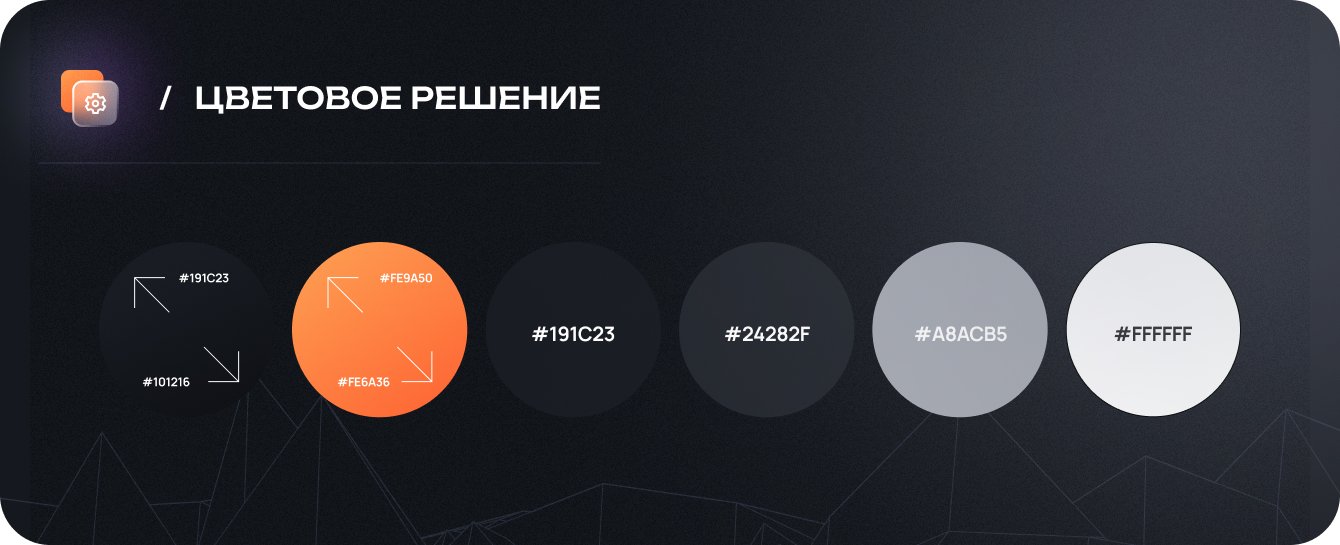 Мы выбрали минималистичный дизайн с яркими цветовыми акцентами, чтобы подчеркнуть современность и технологичность. В качестве цветовой гаммы использовали темную тему с теплым акцентным цветом. Добавили минималистичную графику. Настроили анимацию для динамики и большего погружения в мир технологий.