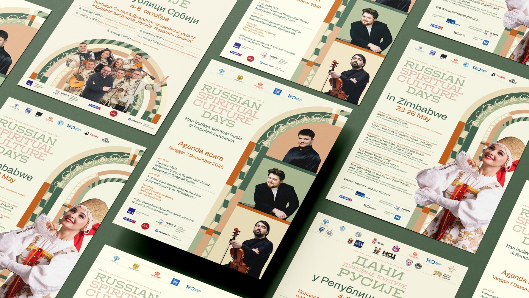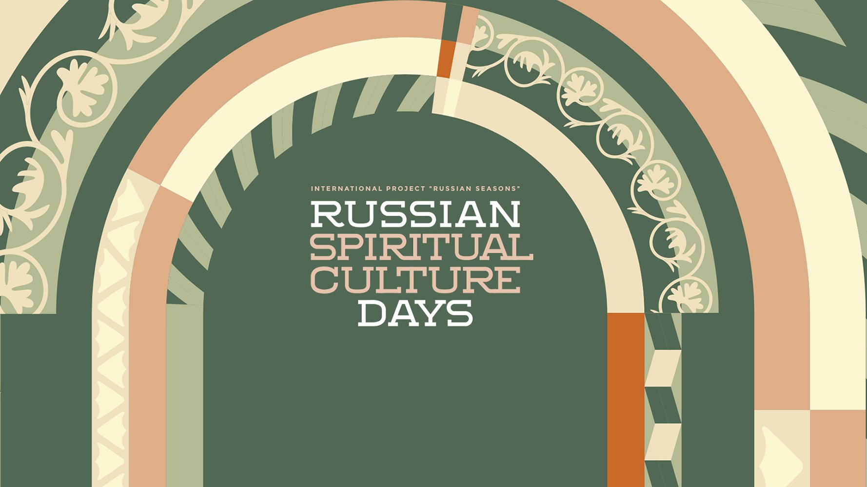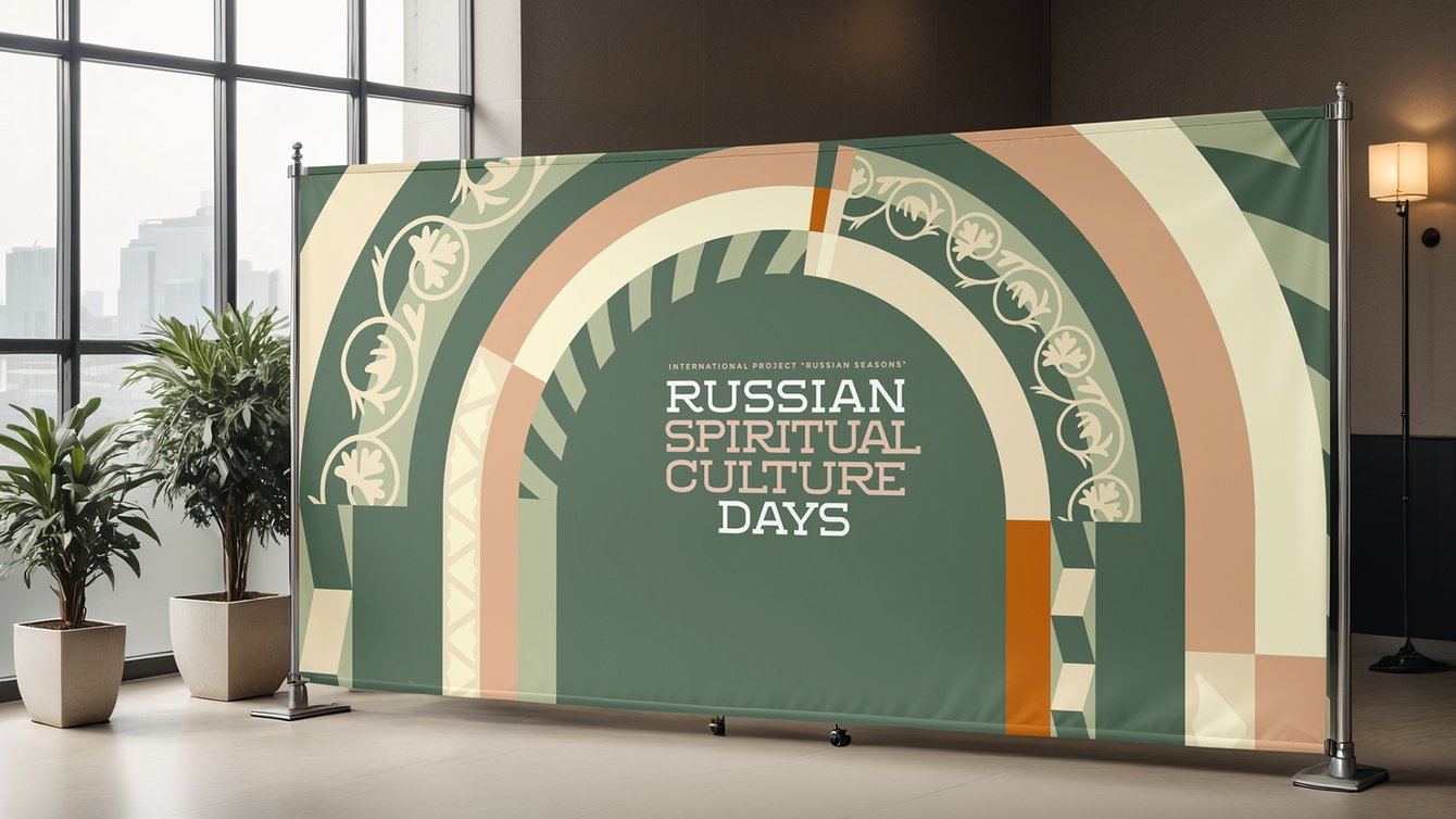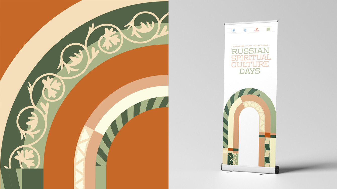 Поскольку «Дни духовной культуры России» проводятся в рамках «Русских сезонов», их оформление мы выполнили в сходной визуальной стилистике. Графический стиль «Дней духовной культуры России» представляет собой переработку и современное переосмысление орнаментальных мотивов оформления порталов Московского Кремля — входов в церковные здания, дворцы и палаты.