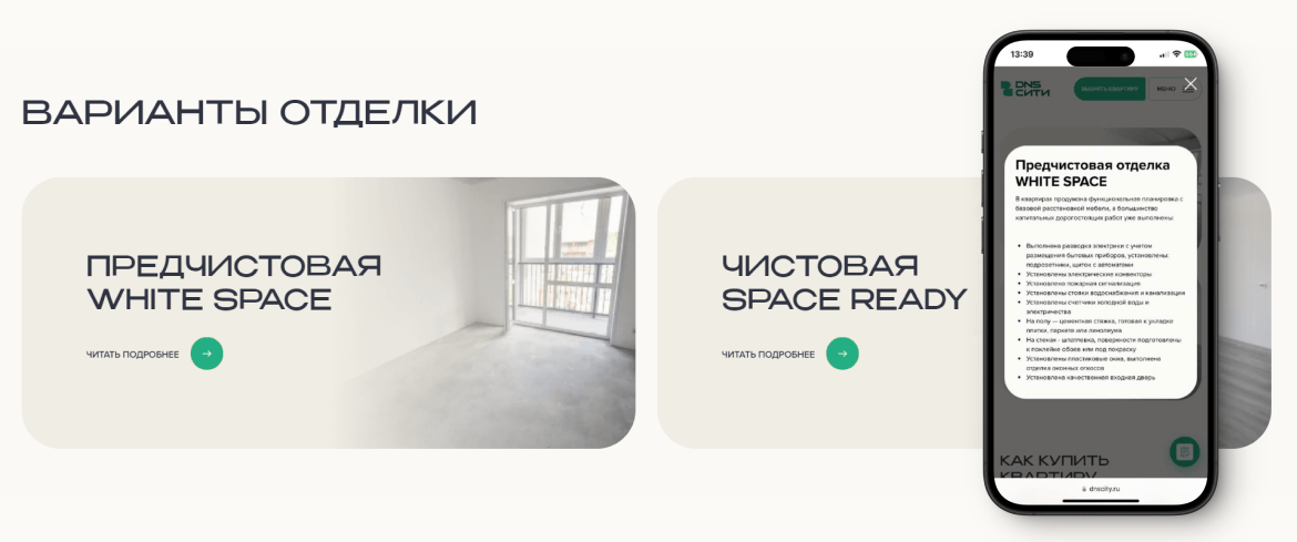 Мы сделали логичную и понятную структуру: от общей информации плавно перемещаемся к более узкой (планировочные решения, отделка, способы покупки и т.д.).