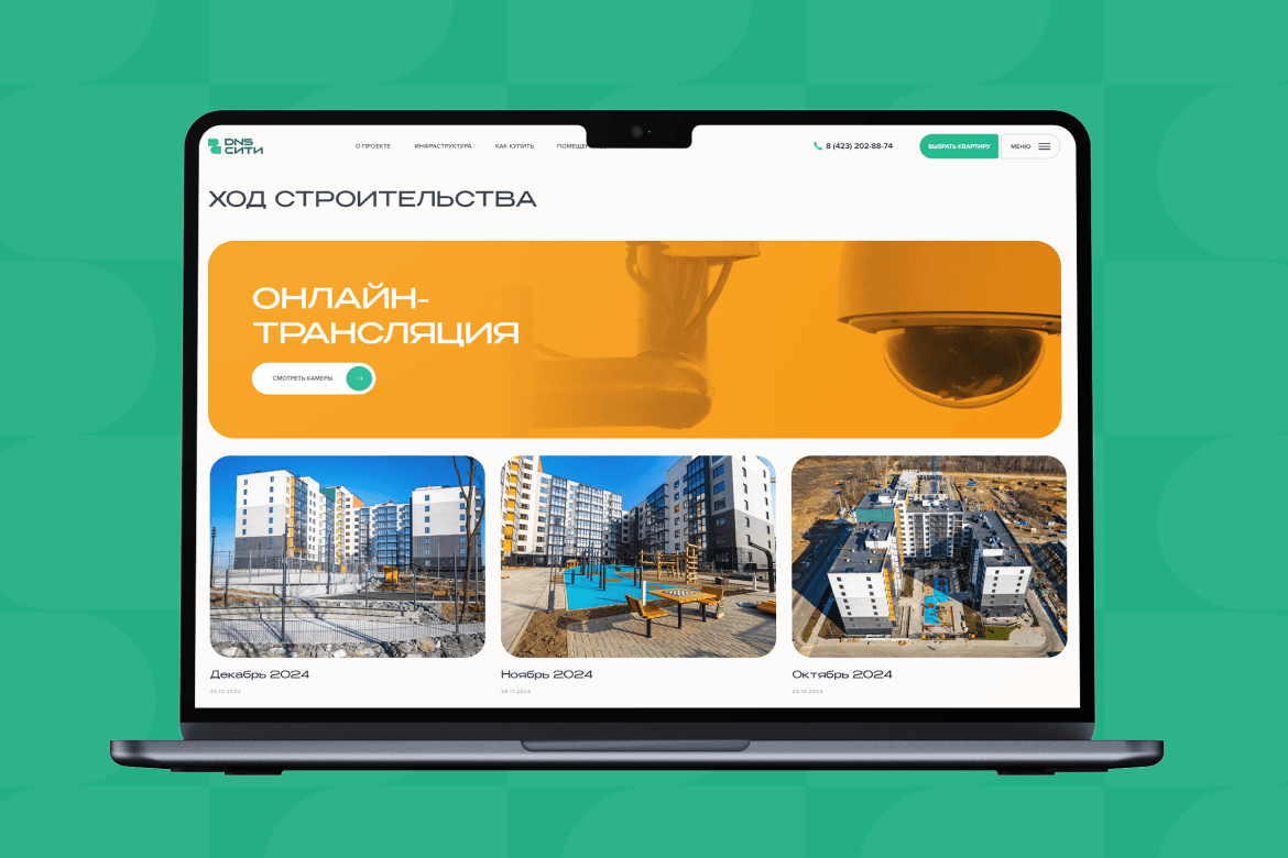 За ходом строительства очень любят наблюдать покупатели либо те, кто в одном шаге от этого статуса. Мы создали лендинг со всеми новостями о ходе стройки. Здесь можно посмотреть онлайн-трансляцию и отчет за каждый месяц. Блок дополнили админ-панелью, чтобы заказчик мог добавлять новости без помощи айтишников.
