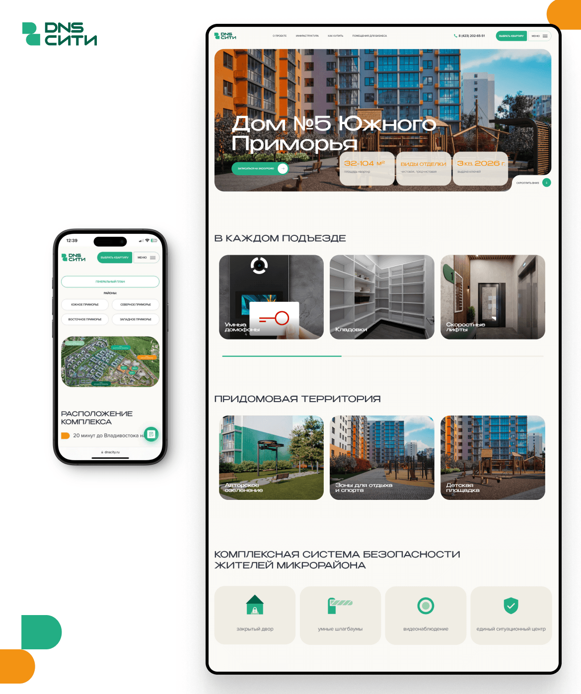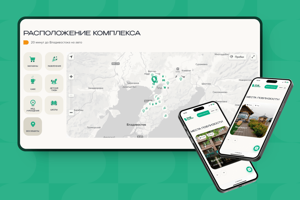 Мы сделали упор на презентации самого района. Это было особенно важно, так как объект находится в 20 минутах от Владивостока. В нашем регионе такие расстояния воспринимаются не очень позитивно при выборе места жительства. Поэтому нам нужно было убедить через сайт, что житель DNS Сити переедет из одного города в другой, где есть все для жизни, и ему просто не потребуется постоянно мотаться во Владивосток.