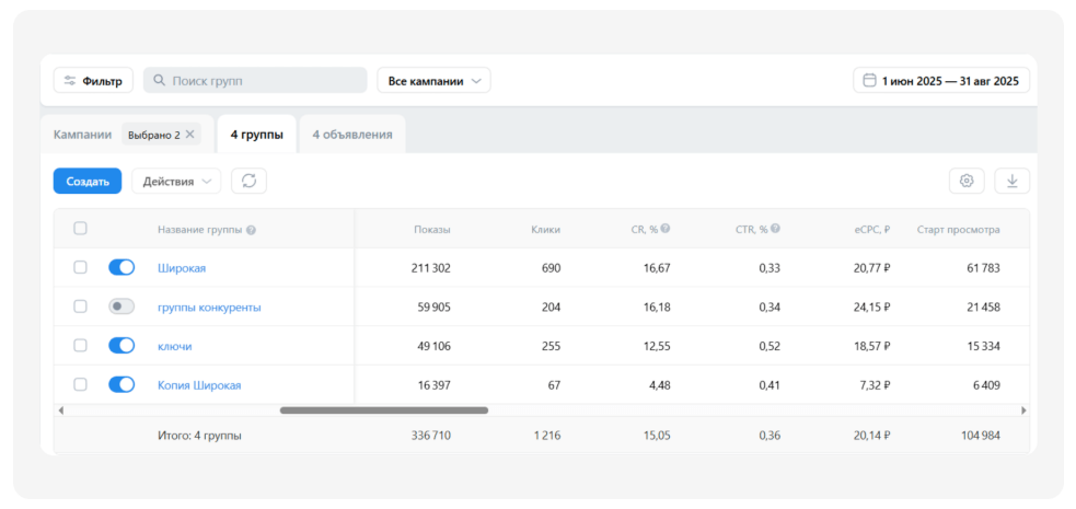 3. Работы с оптимизацией и широкого тестирования креативов и аудиторий. Это позволило быстро определить рабочие связки и сфокусироваться на них.
