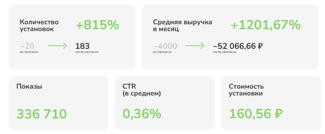 Зафиксирован прямой рост выручки: средняя выручка в месяц через приложения выросла на 1201,67%, что подтвердило прямую окупаемость рекламных вложений.