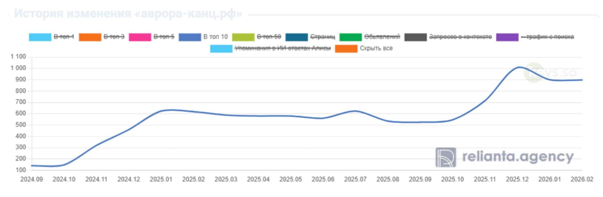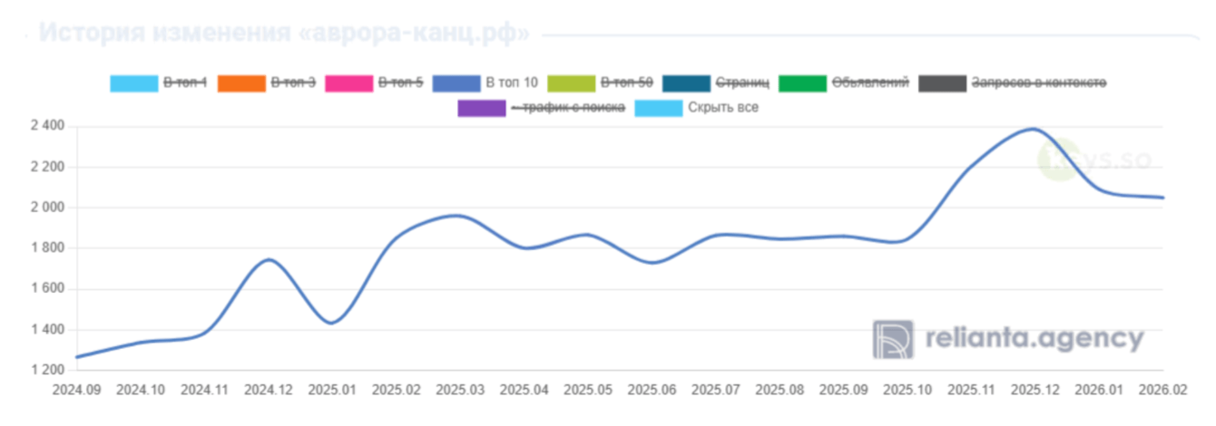 В Яндексе фиксируем рост числа запросов сайта в ТОП-10 на 50% за год. Это ключевой показатель, подтверждающий эффективность выбранной стратегии ссылочного продвижения.