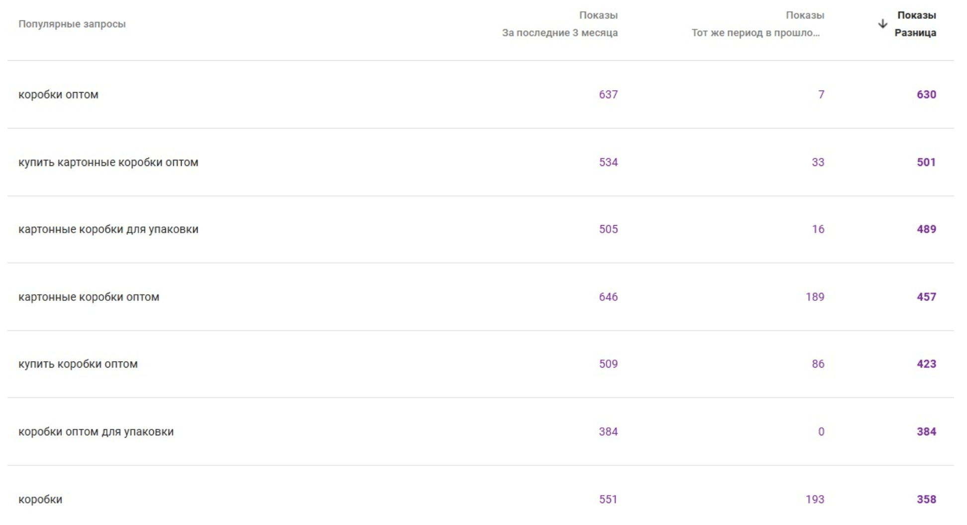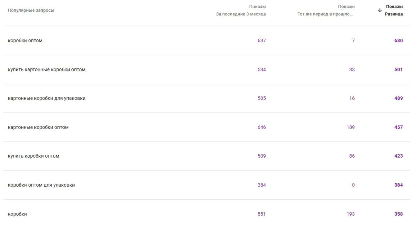 Пример роста показов в Google за счет работы со ссылками и анкорами по кластеру “коробки”: