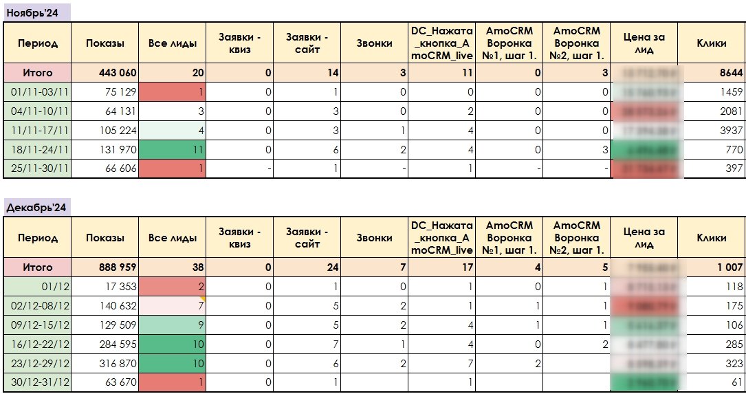 • Тестирование РСЯ показало отрицательные результаты — отсутствие лидов, как следствие — показы в РСЯ были отключены.