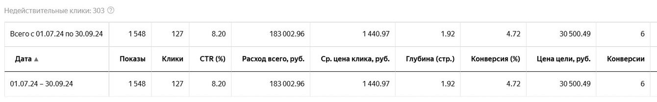 • Средняя стоимость лида (CPL) 30 500 ₽. Лидами считались звонки по Calltouch и отправка заявки за период с 01.07.2024 по 30.09.2024.