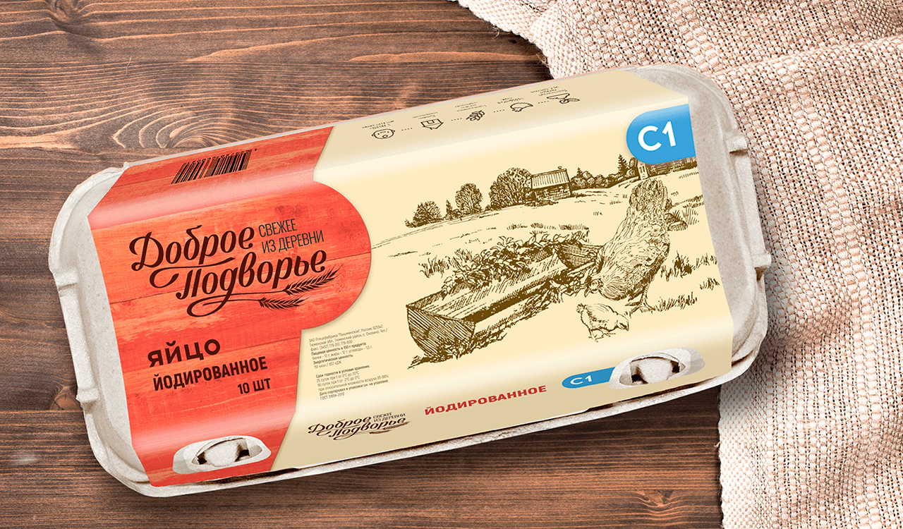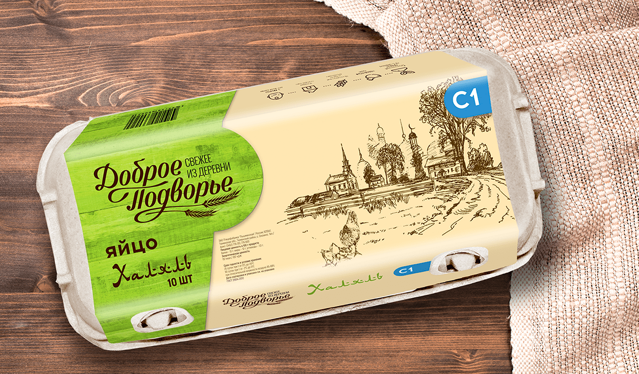Упаковка визуально разделена на две части. В левой на фоне окрашенного дерева располагается логотип и указание на тип продукта (утреннее, халяль, йодированное). В правой части на светло-бежевом фоне размещен гравюрный рисунок, иллюстрирующий деревенскую жизнь. В пасторальной сценке всегда присутствуют курицы и цыплята, но в целом картинка отражает тип продукта: так в яйцах «Халяль» на заднем плане виден силуэт мечети. На цветных плашках указывается сорт яиц, что позволяет покупателю быстро сделать выбор. На боковой части упаковки размещены иконки с дополнительной информацией.