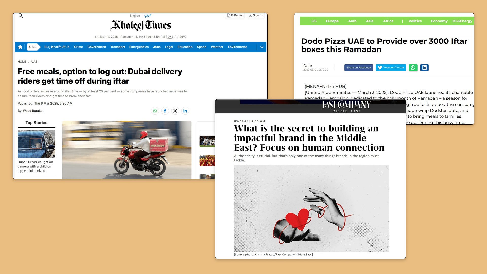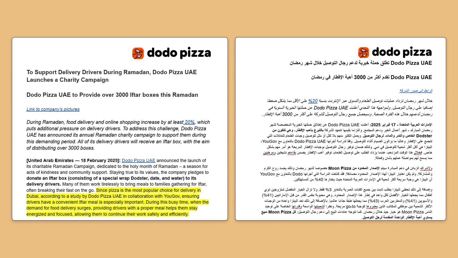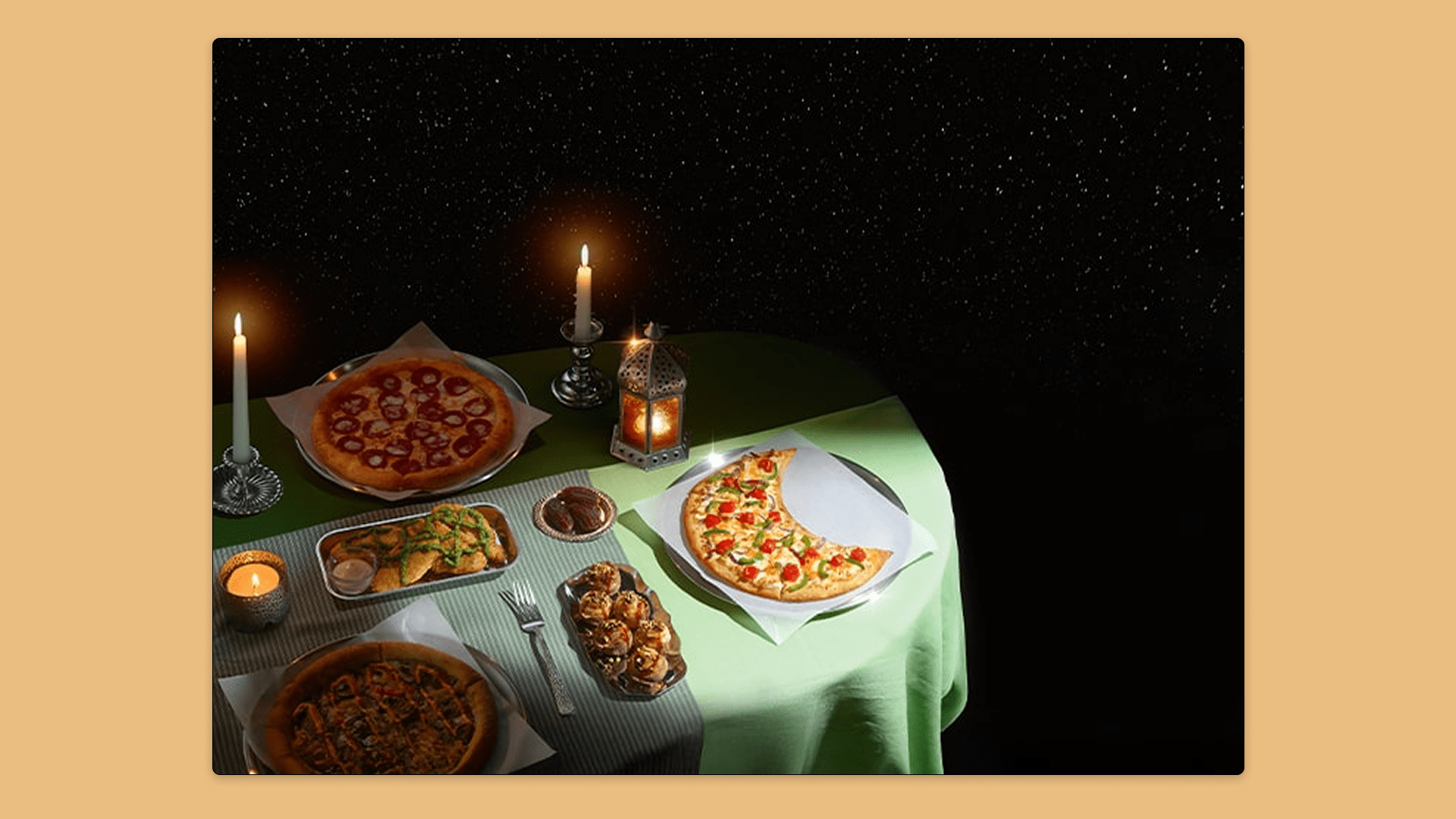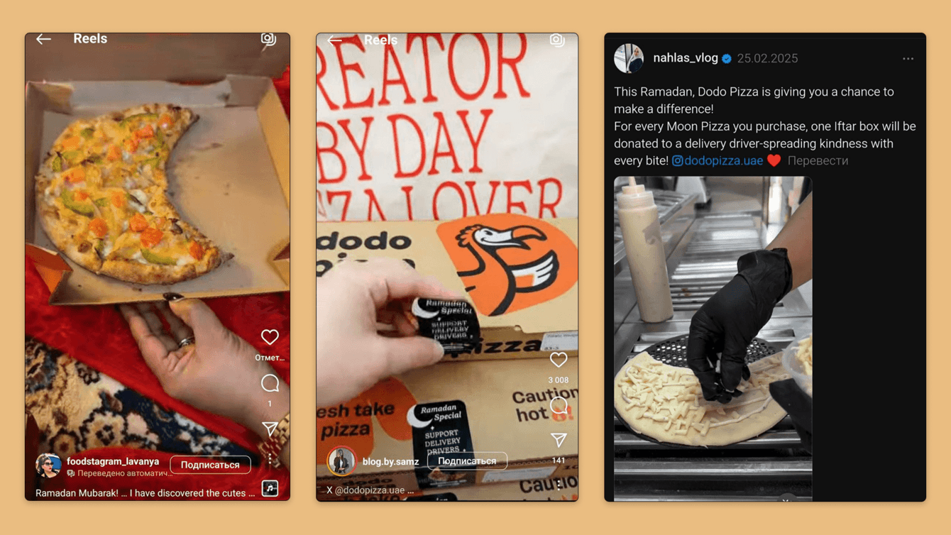 Чтобы поддержать доставщиков в сезон пиковой нагрузки, Dodo Pizza UAE придумали специальную акцию в Дубае. Компания сделала пиццу «Луна» в форме полумесяца — символа Рамадана. Такая идея помогла выделиться среди конкурентов и предложить клиентам особенный продукт.