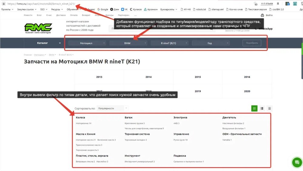 3. Большая база запчастей, в которой отмечена их применимость к модели мотоцикла — это большая редкость. Заказчиком была проделана огромная работа по сбору и внесению данных на сайт. Грамотное использование этих данных привело к отличным результатам!